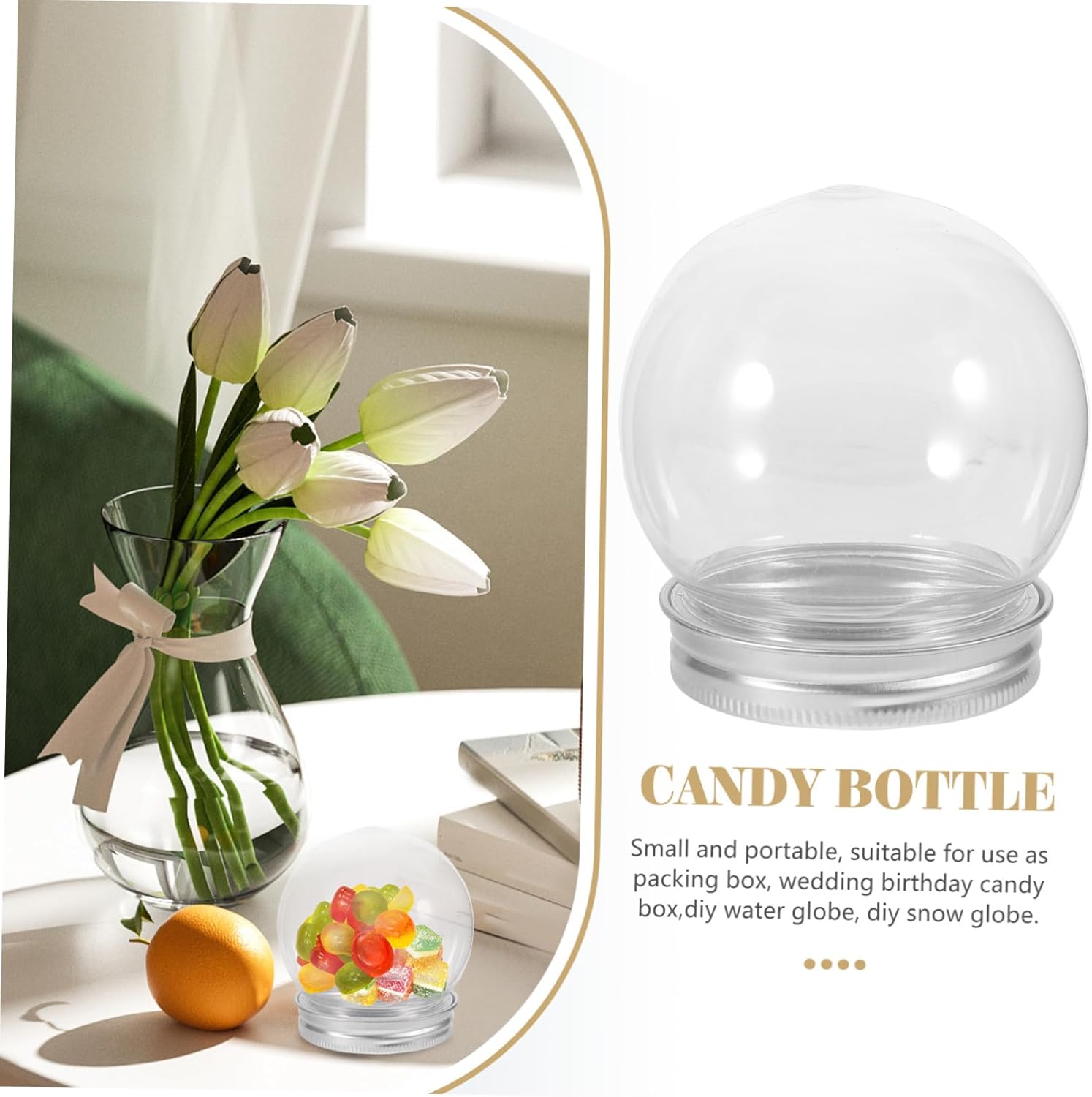 Package List 12 x Candy Bottle Features -Size:7.00X6.50X6.50cm/2.75X2.55X2.55in(globe) Clear Bottles -Capacity:150ml Favor Boxes Container -Material:Aluminum lid, plastic Wedding present Boxes -Color:Transparent Party Candy Boxes -Size:5.70X5.70X1.50cm/2.24X2.24X0.59in(aluminum lid) Light Bulb Bottle -Size:5.30X5.30X1.40cm/2.08X2.08X0.55in( ) Wedding Chocolate Boxes - Great craftsmanship, delicate shape, texture, beautiful look, fashionable and unique Elegant Party Favors For Adults. - Made of stable and reliable material, it is smooth and transparent, and has bright colors Bridal Shower Favors. - Can be used to hold candy, chocolate, treats, also crafts beads and other small items Candy Bottle. - Suitable for various occasions, such as wedding, birthday parties, etc. Can be applied , dessert shop, restaurant, and etc Holiday Favor Boxes. - It is suitable for personalized weddings, birthdays, festival celebrations and other occasions. It can also be used for small stationery such as small erasers DIY Snow Globe.Goods InformationWedding Chocolate Boxes Come with lid design, the bottles will be sealed, .Bottles For Favors want practical and portable packing containers? Our anti-leak design Bottles can meet your needs.Clear Bottles They are for storing snacks,