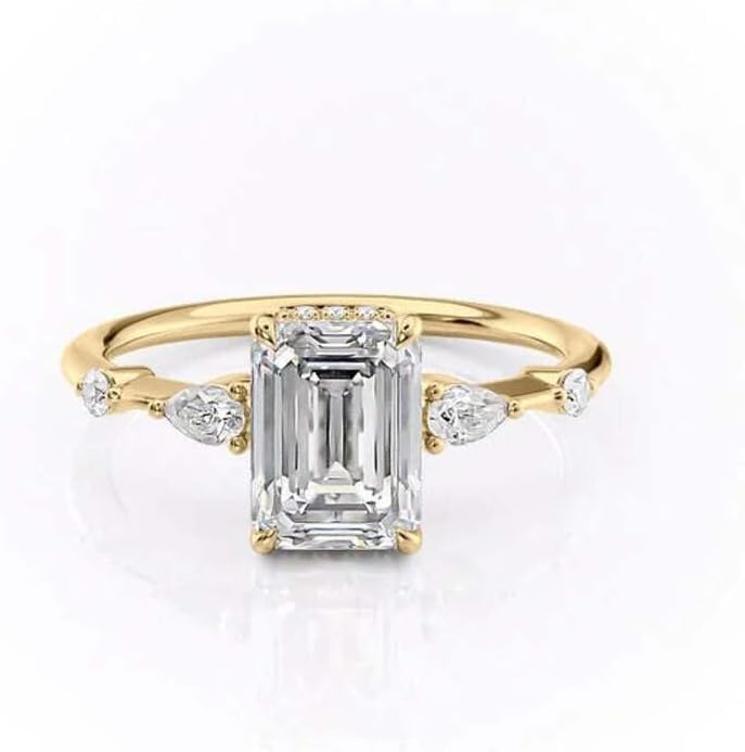 Moissanite is a brilliant, durable, and ethical alternative to diamonds, with a hardness of 9.25 and a higher refractive index (2.65 vs. 2.42), making it exceptionally sparkly. This VVS-VVS1 colorless moissanite ring features a cushion cut center stone, accented with pear or round side stones, and is set in 10K, 14K, or 18K solid gold or 925 sterling silver. Crafted with solitaire-inspired design details and a timeless vintage style, it is made to order to match your preferred carat, metal, and ring size. Perfect for engagements, weddings, anniversaries, or as a meaningful gift. Clean gently with a soft cloth and avoid exposure to chemicals or rough activities.