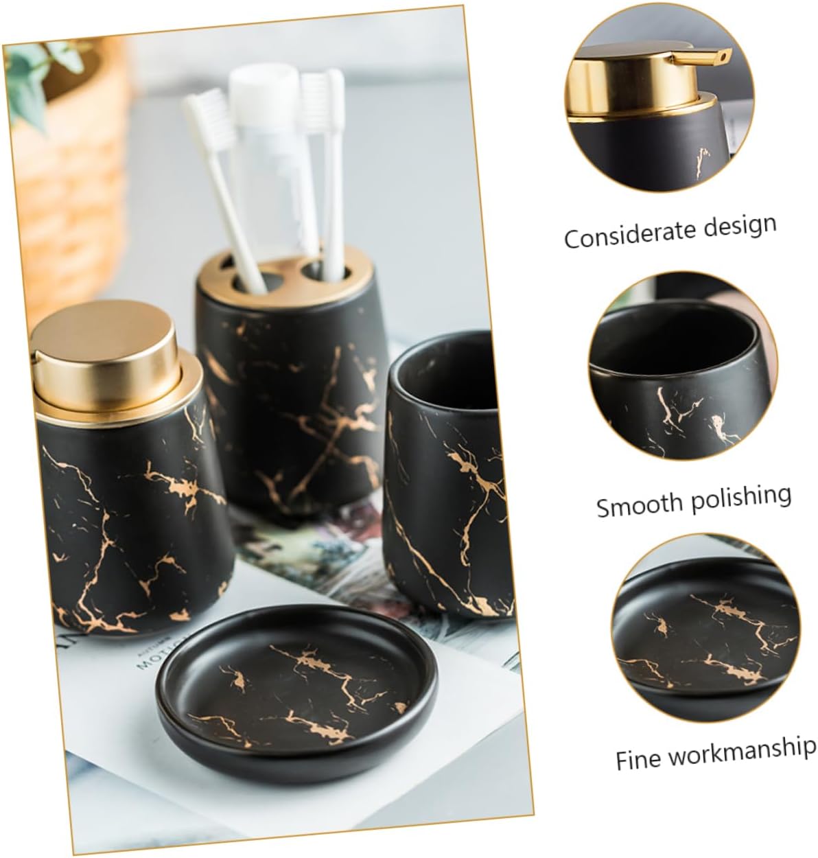 Package Include 2 x cups 1 x soap tray 1 x Lotion bottle Features - Size: 11.40X11.40X2.00cm/4.48X4.48X0.79in Bathroom Washing Supply. - Material: ceramic Soap Dish. - Fine workmanship, smooth polishing, multi-purpose, can be used as a wash cup Lotion Bottle. - Considerate make sure toothbrush and toothpaste are contained clean and neat Wash Cup Set. - This set of wash cup is wonderful, elegant bathroom accessories organizer with great Soap Tray. - This set includes two cups, one lotion bottle and a soap tray, convenient to use Toothbrush Holder. - Small size and portable, convenient to carry and store. Simple and classic appearance Toilet Washing Container.Goods DescriptionToothbrush Cup Chic polishing and smooth surface.Soap Tray This item is a set of bathroom washing cup, which is made of for use.Lotion Bottle Fine workmanship and beautiful appearance, can ensure its popularity among women and men