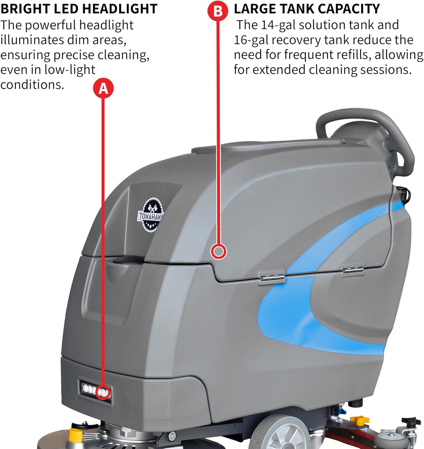 The Tomahawk Auto Scrubber delivers efficient, thorough cleaning for commercial and industrial applications. Equipped with a 24V/100Ah battery and dual motor system, this scrubber provides up to 3 hours of runtime, making it ideal for large spaces. Its 20-inch motorized brushes and 14-gallon solution tank ensure high-performance cleaning, while its ergonomic design and intuitive controls simplify operation. Designed for durability and reliability, the TAS850e features a 16-gallon sewage tank and adjustable squeegee components for effective waste management. Whether you're cleaning hardwood, tiles, laminate, or concrete, this scrubber delivers sparkling results with reduced effort.
