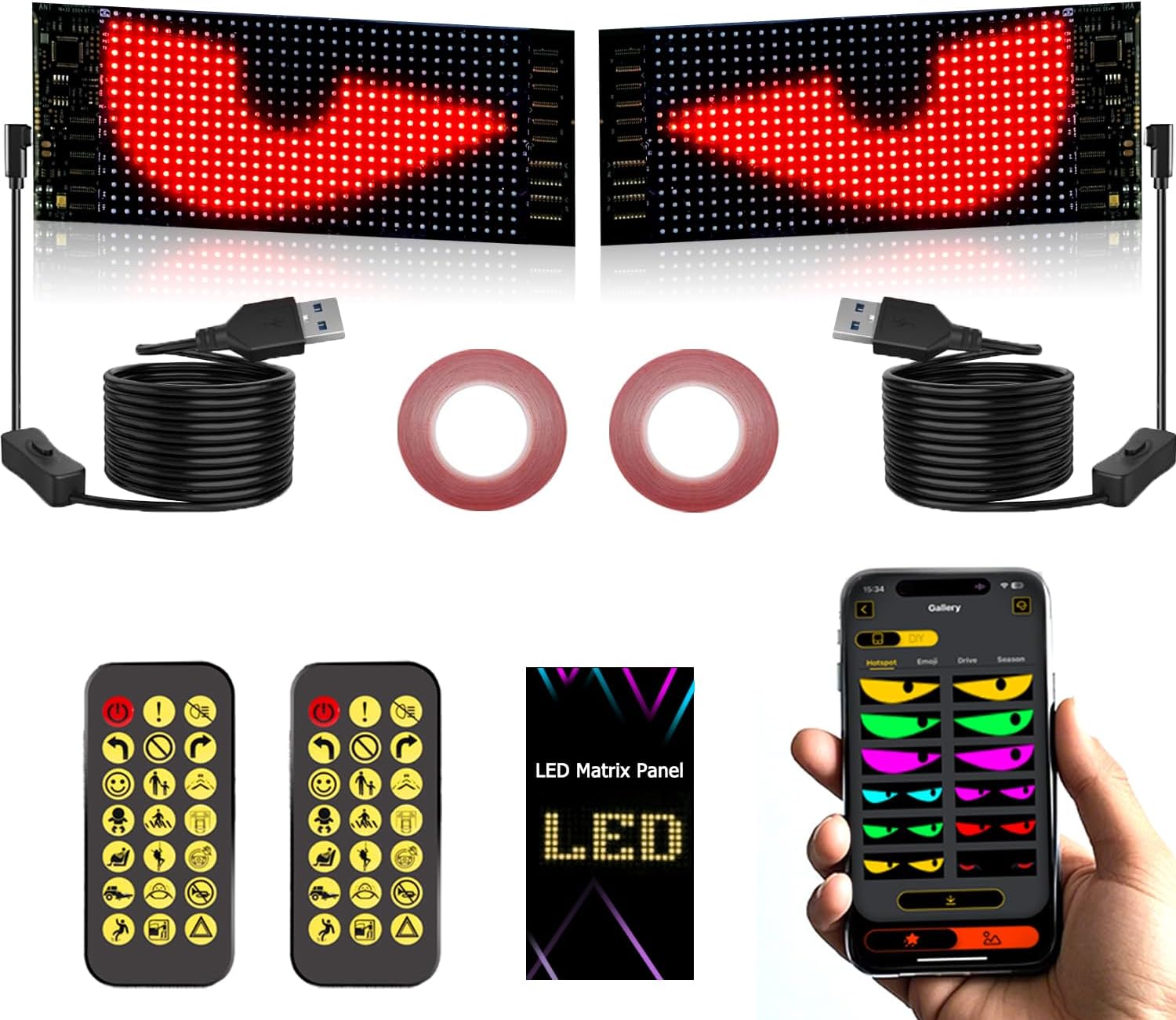 | Included Components | 2pcs 23.42x4.72 inch Windshield Eyes Animated LED for Truck, 4.5M USB Cable, Double Faced Adhesive Tape, Mobile App Controller |
