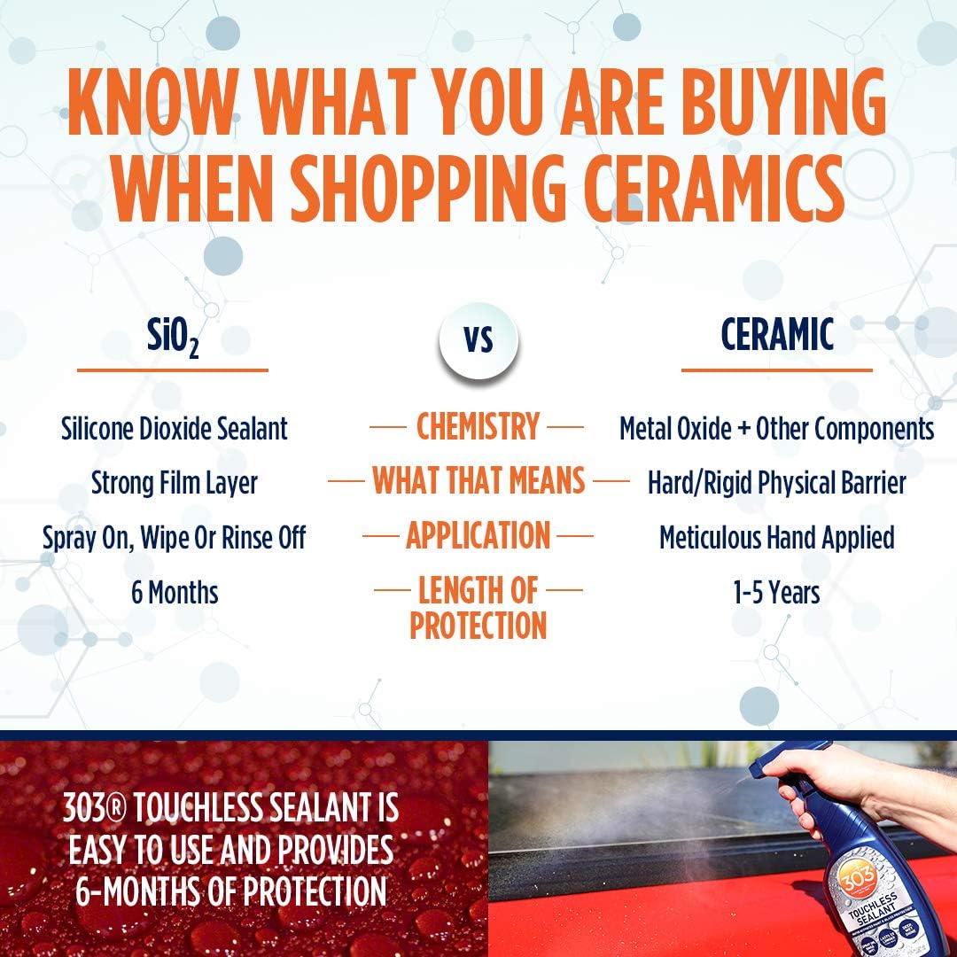 Have you had trouble finding time to fully wax your car? 303 Touchless Sealant will save you hours! This Si02 formula is a completely touchless quicker alternative to waxing your vehicle. Simply spray on, and rinse off – it’s that easy! It only takes minutes to get that same water beading protection you get from a full wax, saving you hours spent in the garage. It’s also great for those looking to prolong the time in between waxes, or ceramic coatings. Safe for clear coat, gel coat, fiberglass, plastics, windshields and wheels too!