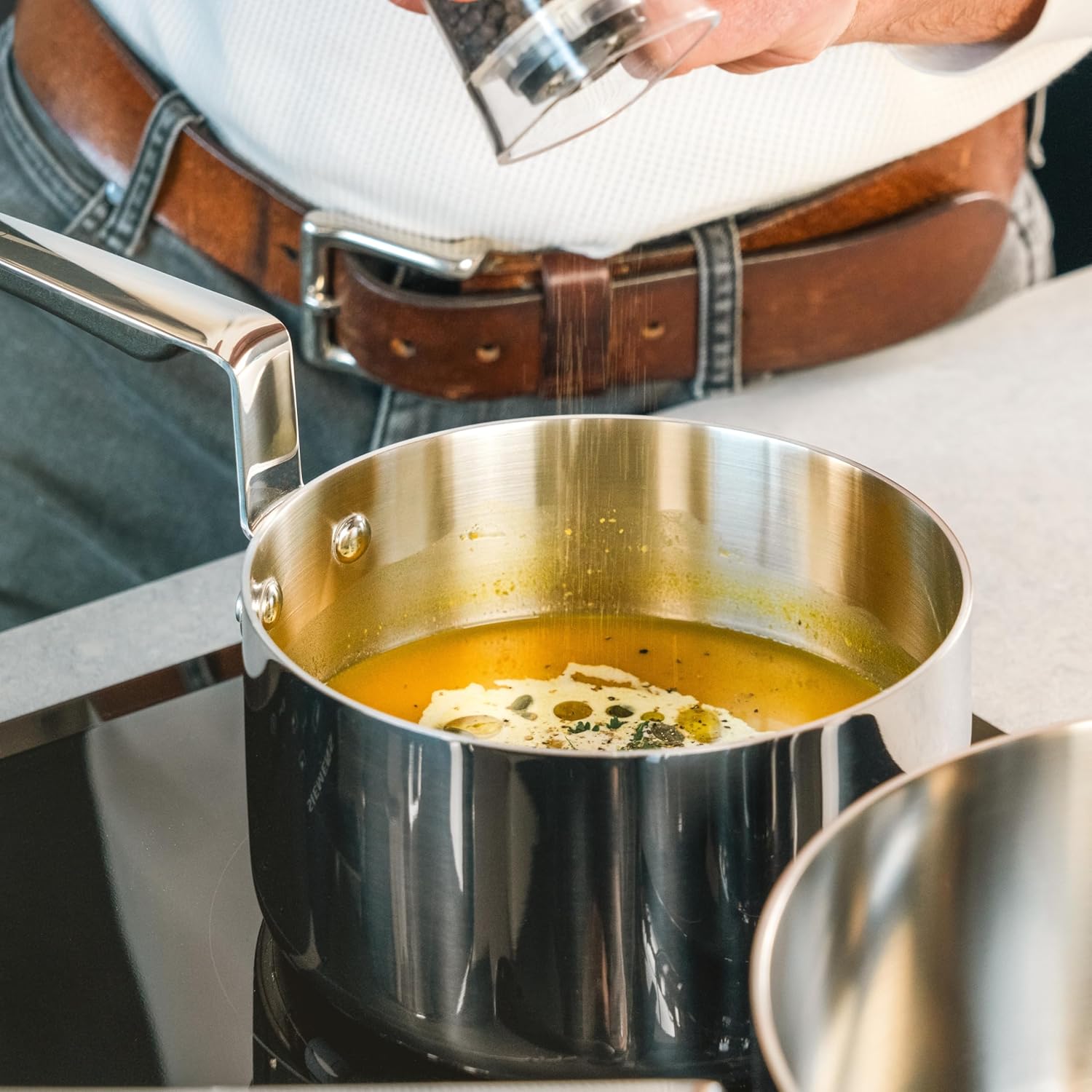The Commichef 4-piece cookware set, including 16 cm, 18 cm, and 20 cm saucepans with lids and a 24 cm frying pan, is a perfect choice for various cooking needs. This set features a tri-ply construction of stainless steel and aluminum, ensuring quick and even heat distribution for precise cooking control. The 304 stainless steel interior is durable, safe, and free from additional coatings. The brushed finished 302 steel inner layer and mirror-polished exterior add style and sophistication to your kitchen. The stackable design ensures easy, organized storage. This set is oven-safe and ideal for simmering sauces, frying, searing, and sautéing. With its professional performance and sleek style, this cookware set is an excellent choice for home chefs.