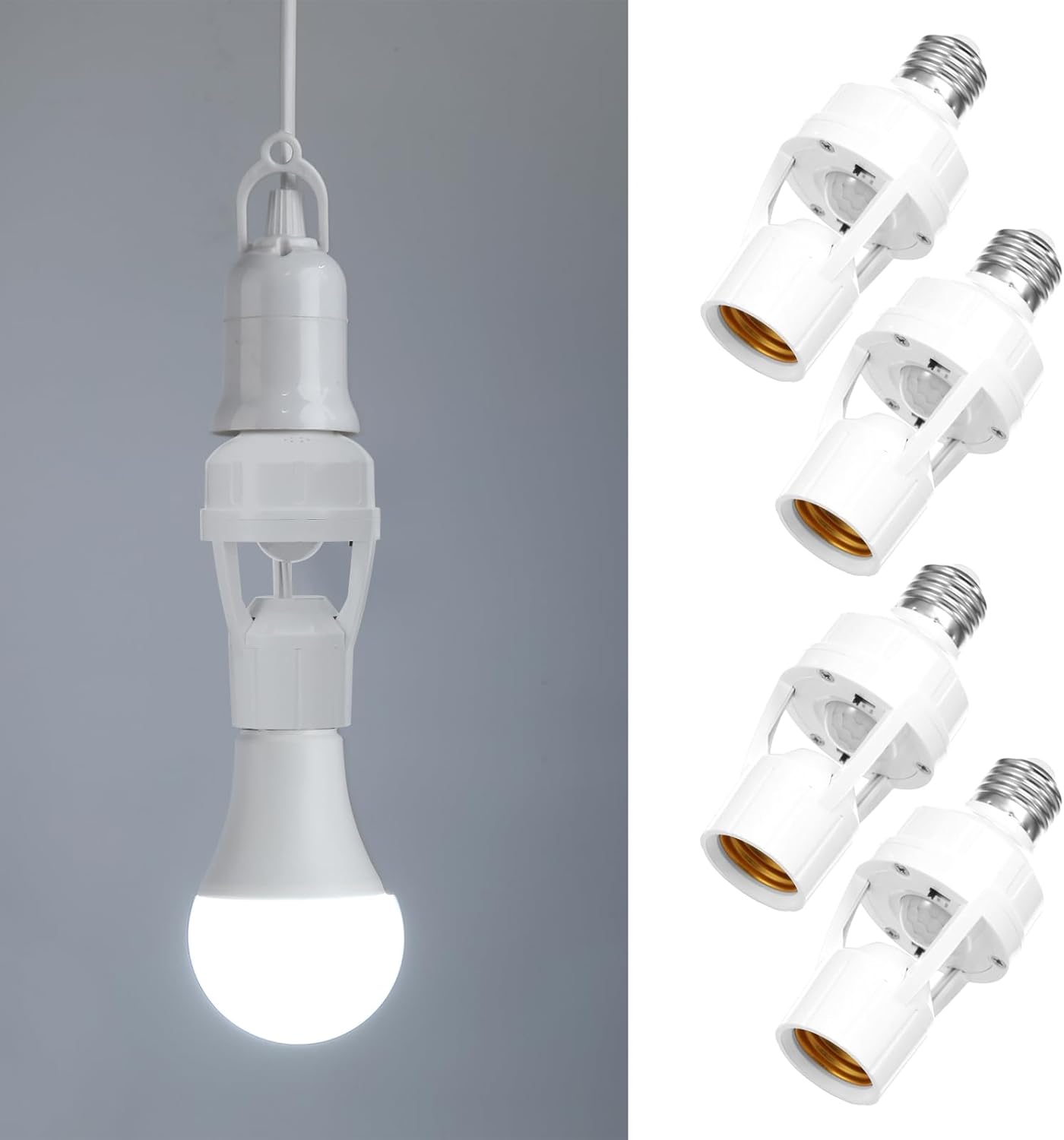 Product description Parts List:4 x Motion Sensor Light SocketDetailed description:Description:This motion sensor light socket supports tool free and easy installation . It is suitable for dimly lit spaces such as stairwells , corridors , and garages , providing an intelligent and energy efficient lighting solution .Key Feature :You Will Receive : You will receive 4 motion sensor light sockets .Specification :Product Name : Motion Sensor Light SocketSize :Overall Length : 12cm/4.8inch Metal Head Diameter : 2.7cm/1inch Tail Diameter : 3.7cm/1.5inch Material : ABSColor : WhiteNote :1 . There may be slight differences between the picture and the actual color of the commodity . We will try our best to show you the exact color .2 . Please allow slight dimension difference due to manual measurement . Manufacturer Contact Information 5729228805451