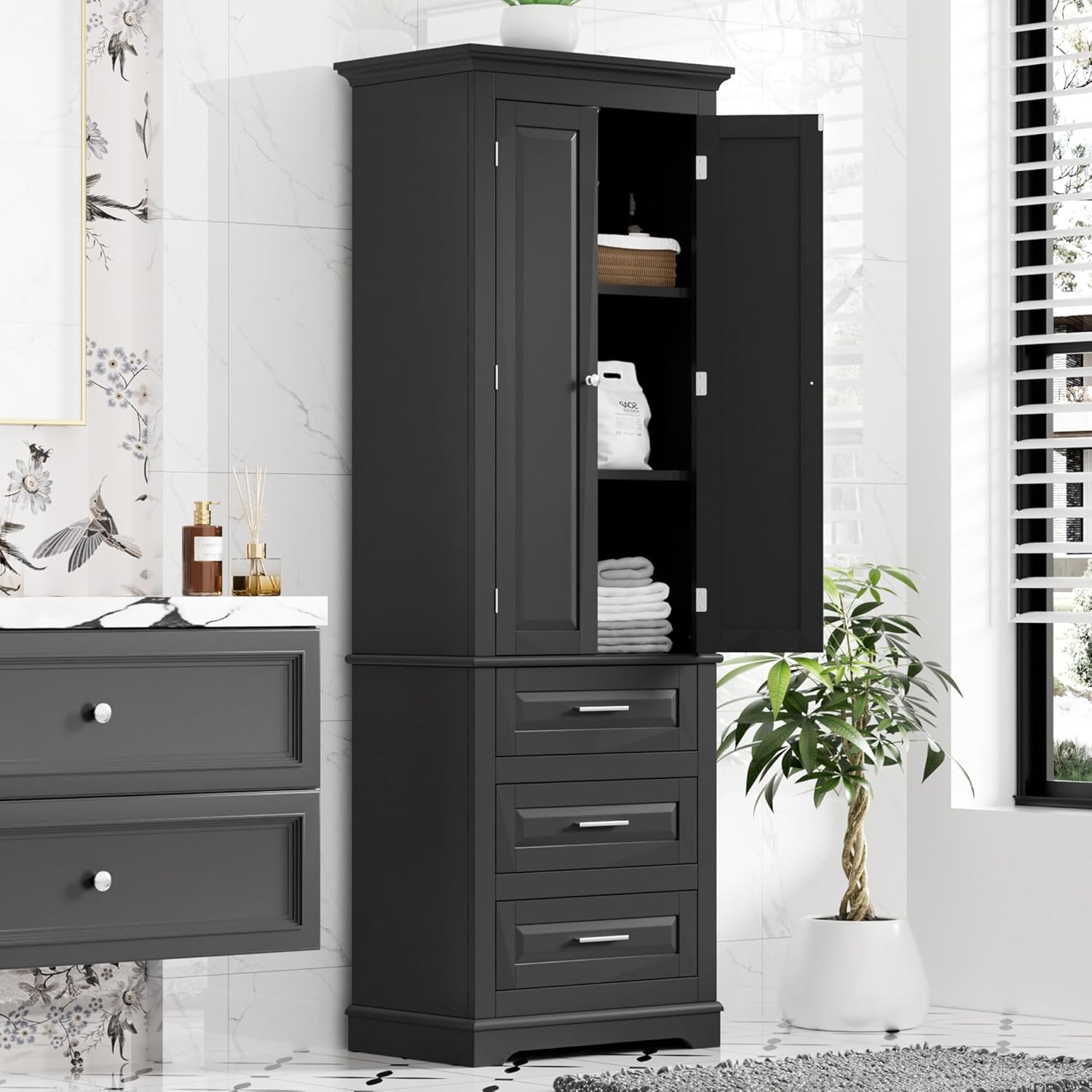 Not only does this storage cabinet provide ample room to organize your belongings, but its sleek design complements any décor, from modern to classic. It’s a versatile, space-saving solution that brings both order and elegance to your home, making it an irresistible choice for any room.Freestanding & Functional Storage Solution: Whether you need extra storage for your bathroom essentials, laundry supplies, or household items, this tall cabinet provides a stylish and practical solution to keep your home organized and tidy.Safe & Secure Design: Comes with an anti-tip safety kit to securely attach the cabinet to the wall, preventing accidental tipping—ideal for homes with children and pets. The smooth drawer slides ensure effortless operation without jamming.Material & Durability: This storage cabinet is crafted from high-quality MDF boards, ensuring durability and long-lasting use. The smooth surface is easy to clean, making maintenance effortless. Sturdy metal handles and hinges provide enhanced durability and stability, ensuring seamless opening and closing for years to come.