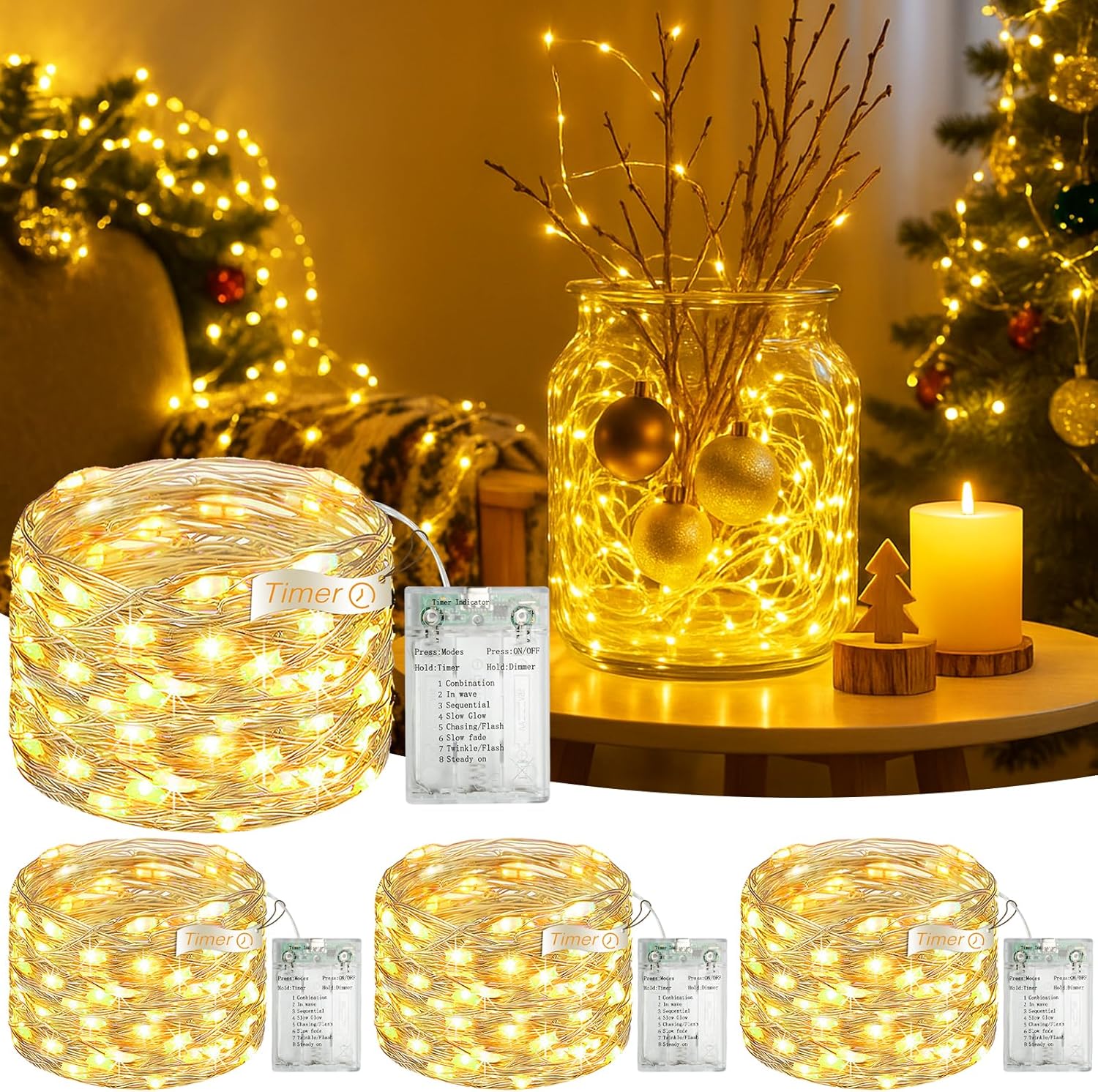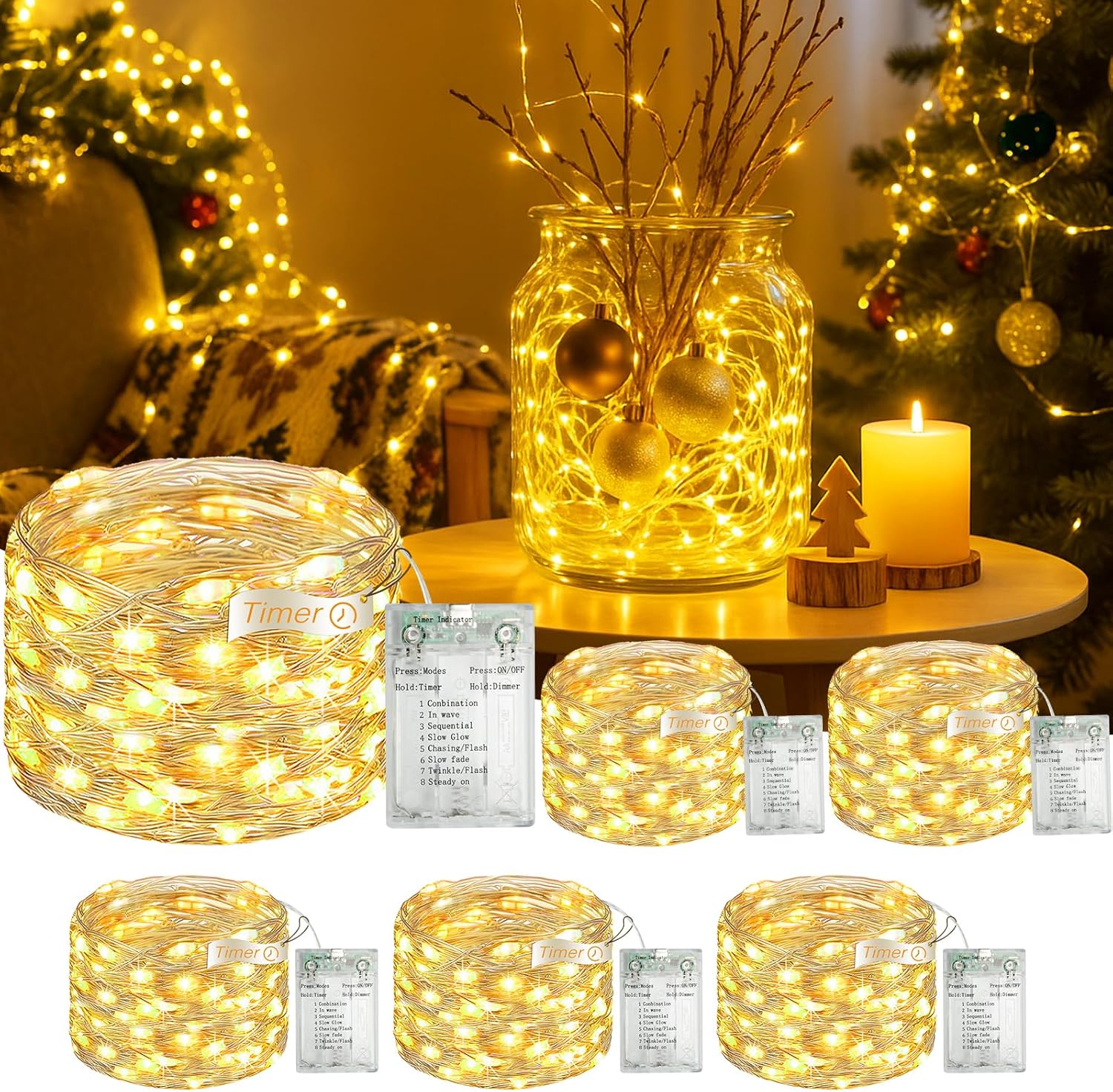 Set the perfect mood for any moment with our 16.4ft Mini Fairy Lights. With 8 unique lighting modes, a smart timer, and flexible power options, you can effortlessly design the ideal ambiance, indoors or out. Key Features & Benefits: 8 Lighting Modes for Every Ambiance Discover the perfect light for any occasion. With a simple click of the button, cycle through a soft steady glow for relaxing evenings, a warm twinkle for a festive feel, flashing patterns for parties, and more. Unleash your creativity and never settle for a single, boring look again. 2-in-1 Charging Freedom: USB or Battery Power Take your decor anywhere! Enjoy the freedom of dual power sources. Plug the USB cable into a wall adapter, power bank, or laptop for endless indoor use. Or, go completely cordless by using batteries (not included) to decorate spots far from outlets—perfect for mantels, centerpieces, or your backyard garden. Safe to Touch & Fully Waterproof for Total Peace of Mind Designed with families in mind. The durable, cool-to-the-touch wires are safe for homes with curious kids and pets. The fully waterproof design ensures complete weather resistance, so your lights remain stunning and functional through rain or shine, season after season. Flexible Silver Wire to Shape Your Perfect Design Unleash your inner decorator! The highly flexible and bendable silver copper wire holds any shape you create. Easily wrap them around Christmas trees, drape them over mirrors, weave them through wreaths, or arrange them in mason jars, bedrooms, and patios. They are the perfect finishing touch for weddings, birthdays, holidays, and everyday magic. Perfect for Decorating: Indoor: Bedroom, living room, Christmas tree, mirrors, photos, shelves, mason jars, and party decorations. Outdoor: Garden, patio, porch, balcony, fence, and backyard gatherings. What’s in the Box? 8*16.4ft Fairy Lights (50 LEDs)