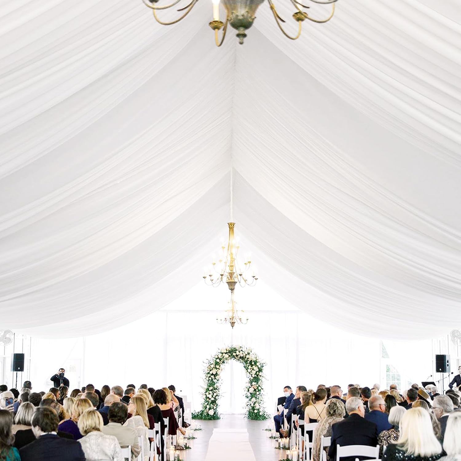 Ivory Ceiling Drapes Fabric 8 Panels 5ftx30ft Backdrop Curtain Ivory Ceiling Draping for Wedding Parties Ceiling DecorationsPRODUCT DESCRIPTIONQuantity: 8 panels ivory ceiling drapery, not include standColor: WhiteSize: Each drapes panel is 5feet wide 30feet longMaterial: 100% Polyester FabricFEATURESEasy to HangThe ivory wedding ceiling panels have a 4 inches pocket for rod or pole entry at the top and bottom of each panel,to create a beautiful draping effect, and to make them soft and flowy.Versatile applicationsOur polyester wedding ceiling drapes can be applied to embellish your backup arch and ceiling for any wedding ceremony theme.Ceiling drapes are flexible and is useful for backdrop curtains, bridal arches, draping panels, masking, covering, drape backdrops,ceilings and event panels.Ivory Ceiling DrapesThe polyester cloth ivory ceiling curtain be used for wedding decorations that make your guest are unforgettable.Ceiling Arch Draping FabricCreate beautiful folds or leave it flowing loose onto the floor,add a very soft feeling to your stage at any events.Customers questions about our long polyester ceiling drapesQ: How to install the ceiling drapes?A:With a 4 inches rod pocket at top and bottom for easy of use for pole or pipe draping.You need to buy the right circle or hook to hang up.Tips: There is no hook or circle in the package.If you have no good idea,try hula hoop or make one with white plastic pipe.Q: What should pay attention to when cleaning this polyester fabric?A: You can wipe the surface with a damp cloth.These ceiling draping are recommended for hand wash in cold water with mild detergent or machine wash in the gentle cycle with laundry bag.Do not bleach,lay flat or hang to dry.