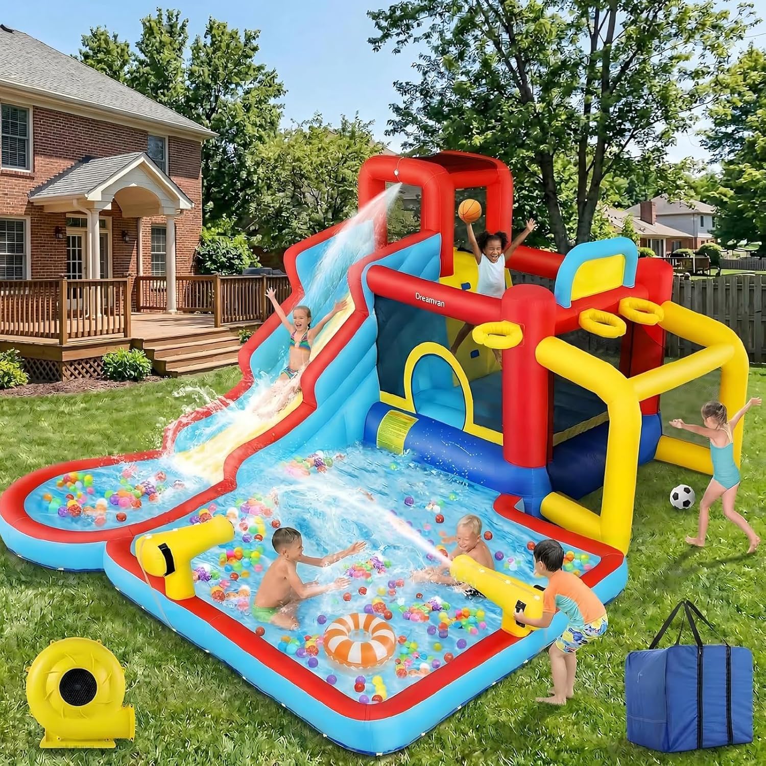 | Included Components | Air blower, Blower stakes, Mega Water Slide, Plastic stakes, Repair patche |
