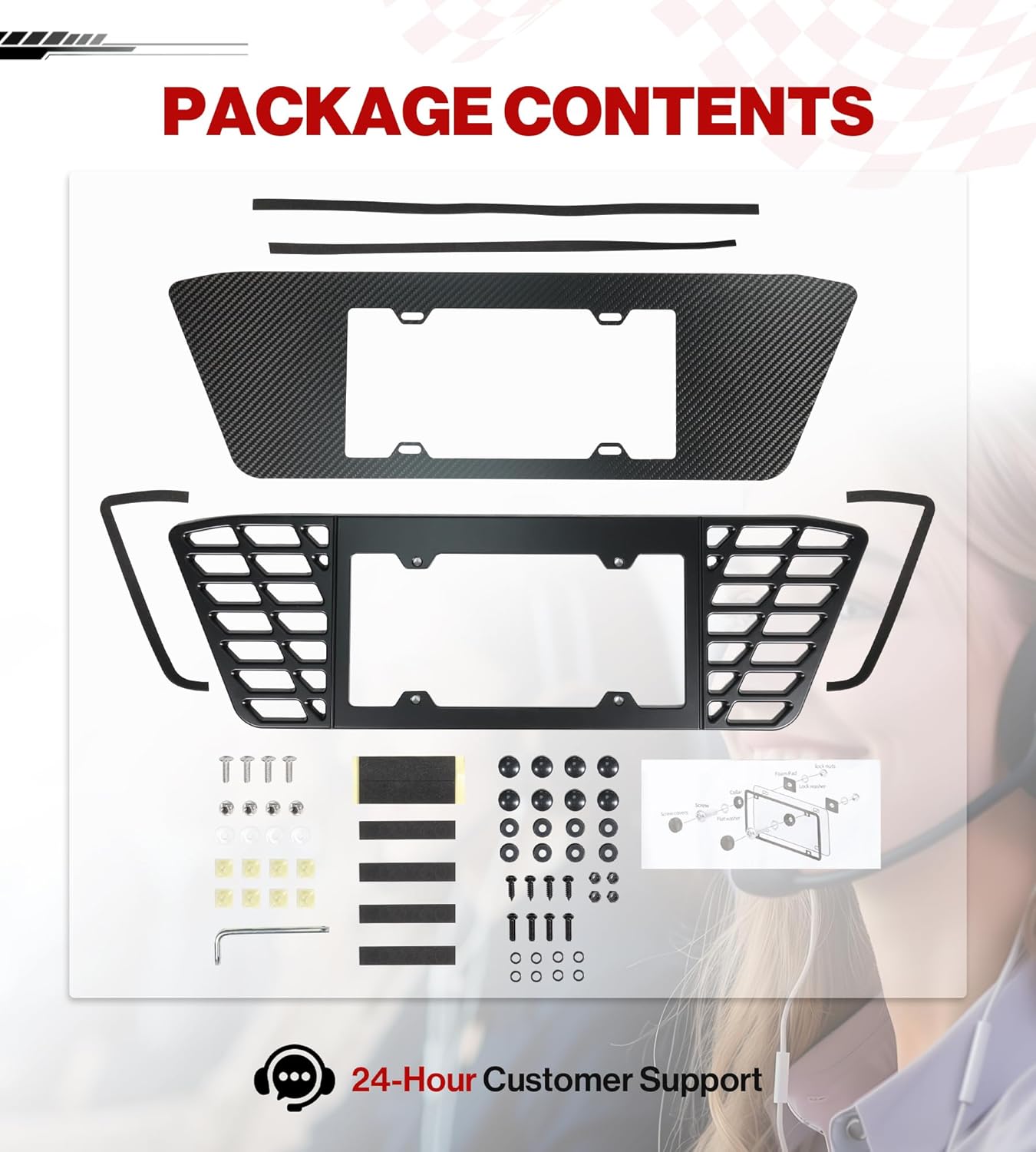 | Included Components | All accessories required, Carbon Fiber Background, License Plate Frame |