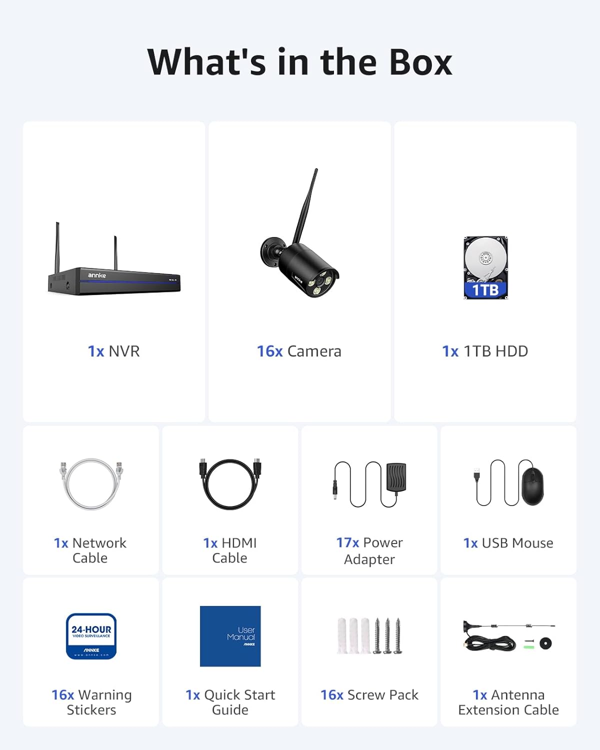 ANNKE Wireless Security Camera System-16CH Expandable 4K Security NVR, 16Pcs 2K Outdoor Cameras, 2-Way Voice, Motion Alert, Weatherproof, Mobile App-Controlled for Indoor/Outdoor Use, 1TB