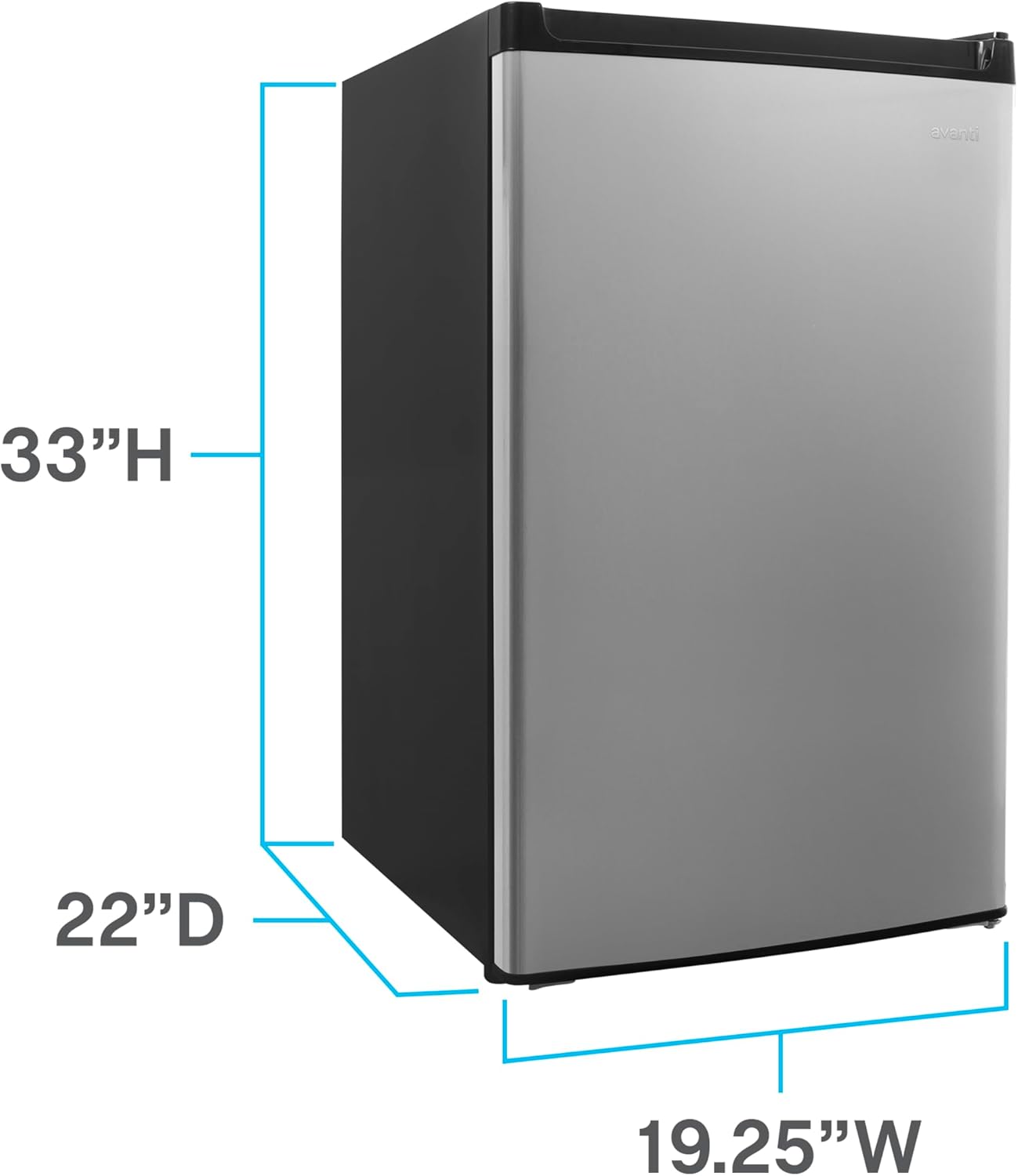 The Avanti AVARM4436SS refrigerator is black and counter-high, has a stainless steel door and a full-width freezer compartment, and is suitable for storing food and keeping it cold. The glass shelves can be adjusted to different heights to accommodate the refrigerator's contents. The door has two half-width storage bins, one full-width bin that accepts gallon-size jugs, and a dispenser that holds up to six beverage cans. The door can be installed to open from either the left or right side. The recessed handle facilitates opening and closing. A light illuminates the refrigerator's interior. The thermostat can be used to adjust the refrigerator's temperature and has a button for defrosting. Adjustable leveling legs enable the refrigerator to be leveled on sloped or uneven surfaces. The back of the refrigerator is flat to conserve space. The refrigerator has a 4.4 cu. ft. capacity, weighs 52 lb., and measures 33 x 19.25 x 22 inches (H x W x L). (H is height, the vertical distance from lowest to highest point; W is width, the horizontal distance from left to right; L is length, the horizontal distance from front to back.) It contains R600A refrigerant and is Energy Star certified for energy efficiency. The refrigerator is rated for 110V.Avanti Products manufactures refrigerators, freezers, wine chillers, beverage coolers, microwave ovens, gas and electric ranges, and other consumer appliances. The company is headquartered in Miami, FL.