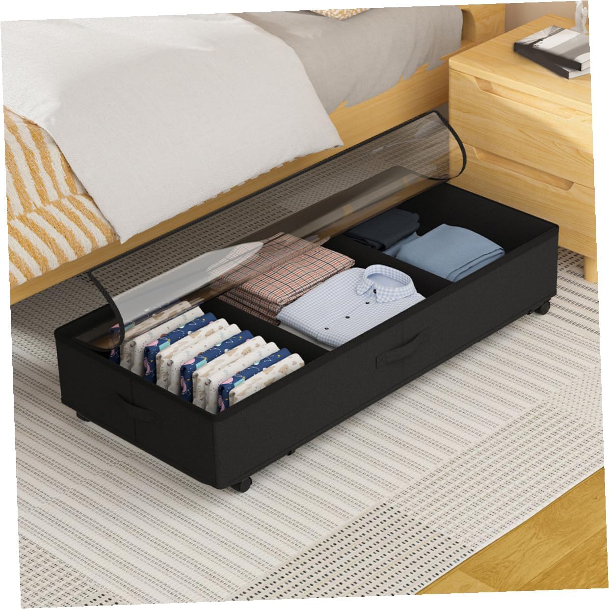 Package List 1 x Under Bed Storage Bag Features -Material:ABS, oxford cloth, iron -Size:80.00X42.00X16.00cm/31.44X16.51X6.29in -Product Info:Under-bed storage truck -Color:Black -Easy mobility: move and retrieve items effortlessly with the sliding wheels under bed clothes case. - With a large capacity, the under bed storage bag can be used to store clothes, blankets, bedding, , etc bedroom under-bed storage boxes. - The handles on the storage bag make it easy for you to move the under bed storage bag storage containers for under bed. - The clothes storage bin with wheel is perfect for closet, shelf, under bed, to make full use of these places for storage storage under bed with wheels. - The zippers on the storage case can open and close easily with fewer efforts, and the transparent window design allows you to see the items in it easily underbed storage boxes.Goods Descriptionunder bed organiser Reasonable design and good craftsmanship make it provide you with a .under bed clear container This under bed storage bag is made of ABS, oxford cloth, iron material for and use.large capacity clothes storage bag A great storage bag for travel, or home storage using
