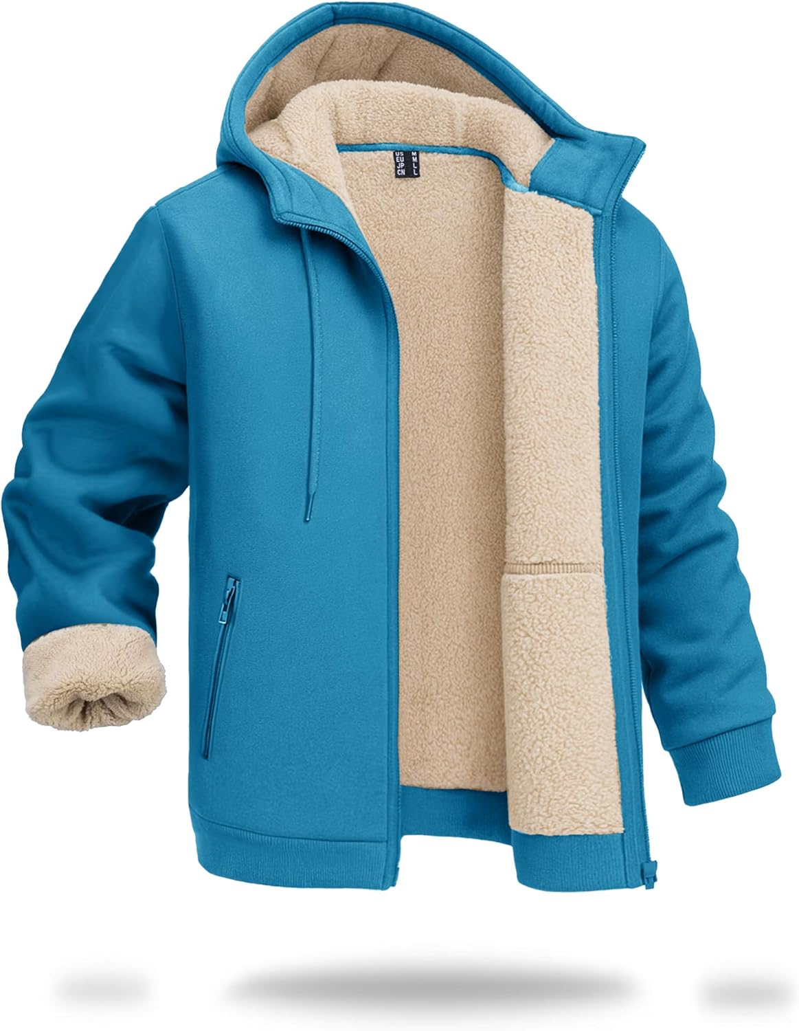 Material Shell: 95% Cotton + 5% Spandex Lining: 100% Polyester sherpa fleece, providing warm insulation and comfort Fabric Features This men’s sherpa lined hoodie is made with heavyweight fleece, offering warmth, flexibility, and a soft touch. The thermal fabric has breathability and stretch, making it comfortable for cold weather and daily wear. Seasons Suitable for fall, winter, and early spring. Keeps you warm during outdoor activities such as hiking, traveling, camping, or work in chilly conditions. Design Style Features sherpa fleece lining, long sleeve build, full zippered front closure, rib-knit cuffs and hem, and an adjustable hood. The insulated design with thick lining provides reliable heat retention, suitable as a fleece jacket or sweatshirt for casual and outdoor use. Care Machine wash or hand wash; do not bleach. Tumble dry low or hang dry. Cool iron if needed. Occasion A practical men’s fleece hoodie designed for versatile use—works well for casual outings, work, or outdoor activities such as hiking, camping, and traveling. Functional details include inside pockets and side zippered pockets to keep small items secure. Note Colors may vary slightly due to monitor settings.