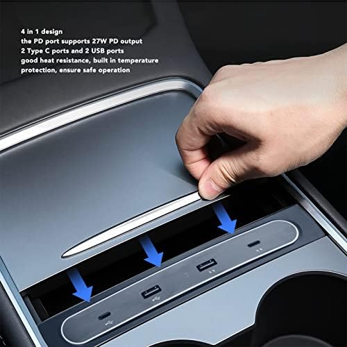 1. Applicable Model: The USB hub docking station is applicable for Tesla 3 Y 2021 and later, please check the model and year of manufacturing before ordering. 2. Multiport: 4 in 1 design, the PD port supports 27W PD output, 2 Type C ports and 2 USB ports, good heat resistance, built in temperature protection, ensure safe operation. 3. Stylish Appearance: The black exterior and LED lights not only make the central control more technological, but also provide lighting at night, improving experience and safety. 4. Multi Funtion: This center console USB HUB provides standard charging and data transfer capabilities. Suitable for smart phones, gamepads, digital camera. 5. Installation: No need to disassemble or destroy the center control, does not affect the use of the center switch and storage box, just a simple operation can be completed. Specification: Item Type: USB Hub Docking Station Material: ABS, metal Fitment: Replacement for Tesla 3 Y 2021 and Later PackageList: 1 xUSB Hub Docking Station