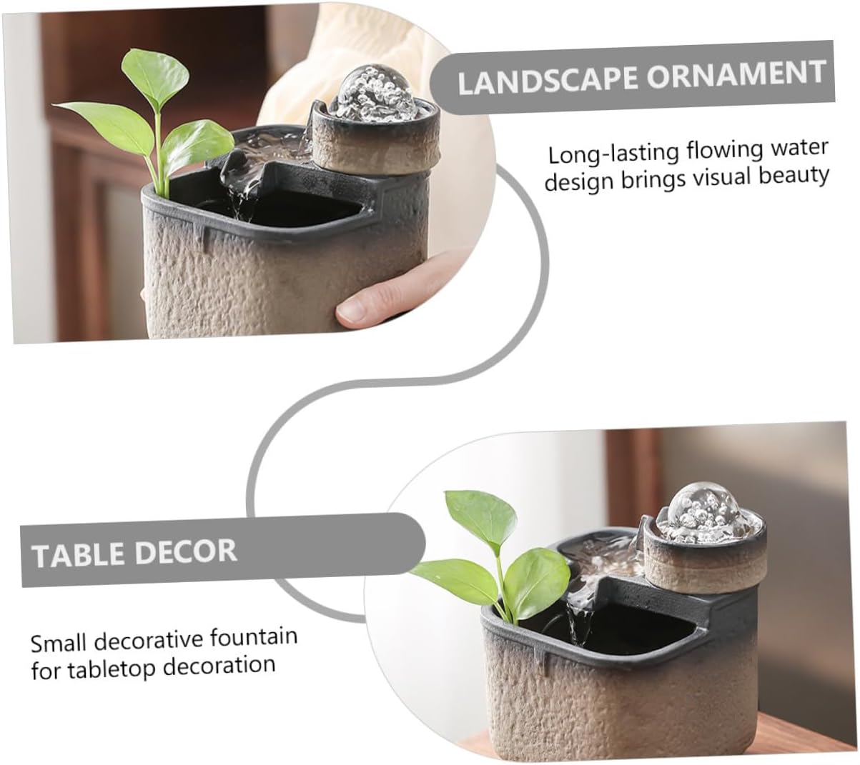 Package Include 1 x Flowing Water Decoration 1 x USB Plug Characteristics -Product Info:Ceramic flowing ornaments - Size: About 17.00X13.00X13.00cm/6.68X5.11X5.11in - Material: Ceramic - Suitable for bedroom, living room, restaurant banquet, etc Desktop Ornament. - flowing water design brings visual beauty, soothes emotions and reduces stress Landscape Ornament. - Made of ceramic, very and reliable for a long period Ceramic Adornment. - Small decorative fountain for tabletop decoration Water Running Ornament. - It is a nice housewarming, birthday or New Year gift for your friends and family members Running Water Adornment.Goods InformationWater Running Ornament Are you looking for a delicate ornament for your desktop? Do you want an ornament which is creative and unique? If your answer is yes, you should come and take at this product.Waterfall Adornment The material enjoys the high durability, not easy to deform or break.Landscape Ornament It is made of , which can withstand the lasting use