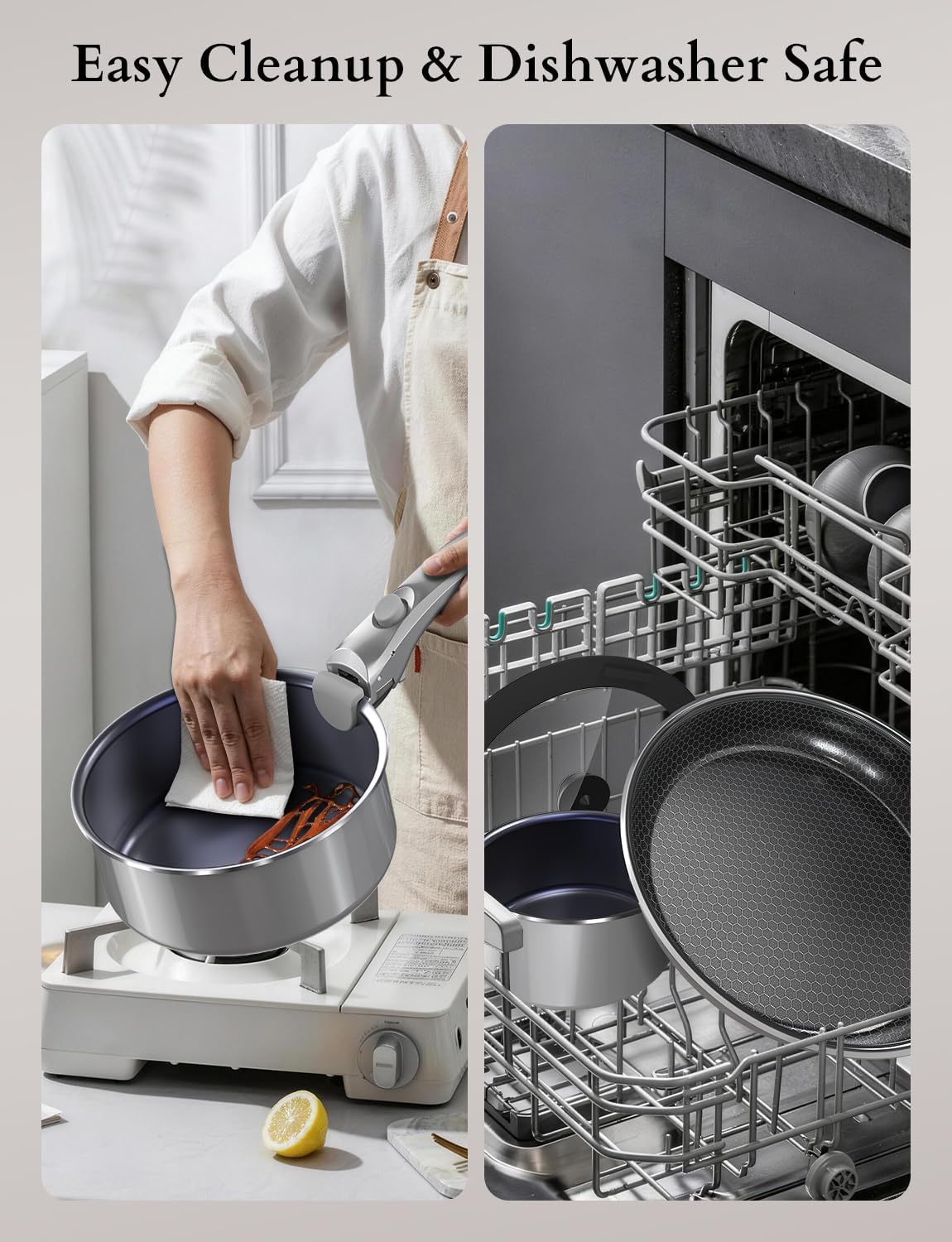 | Included Components | 1x 1.5 QT Saucepan; 1x 2 QT Saucepan; 1x 3 QT Cooking Pot; 1x 5 QT Stockpot; 1x 10" Hybrid 3-ply Stainless Steel Frypan; 2x Detachable Handles; 1x 6"-7" multi-size lid; 1x 9"-10" multi-size lid; 1x Spatula; 1x Soup Ladle; 1x Foldable Trivet; 1x Document Pack |