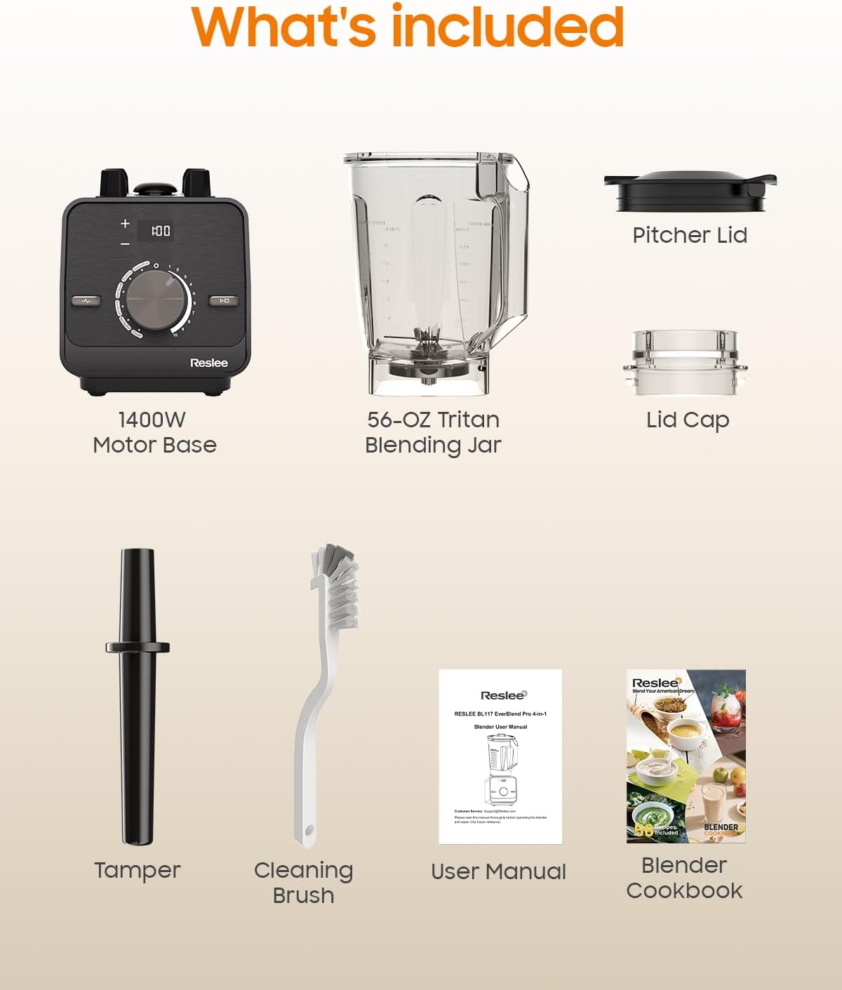 | Included Components | ➤Reslee Motor Base➤56-OZ Tritan™ Blending Jar➤Pitcher Lid➤Lid Cap➤Cleaning Brush➤Tamper➤User Manual➤Blender Cookbook |