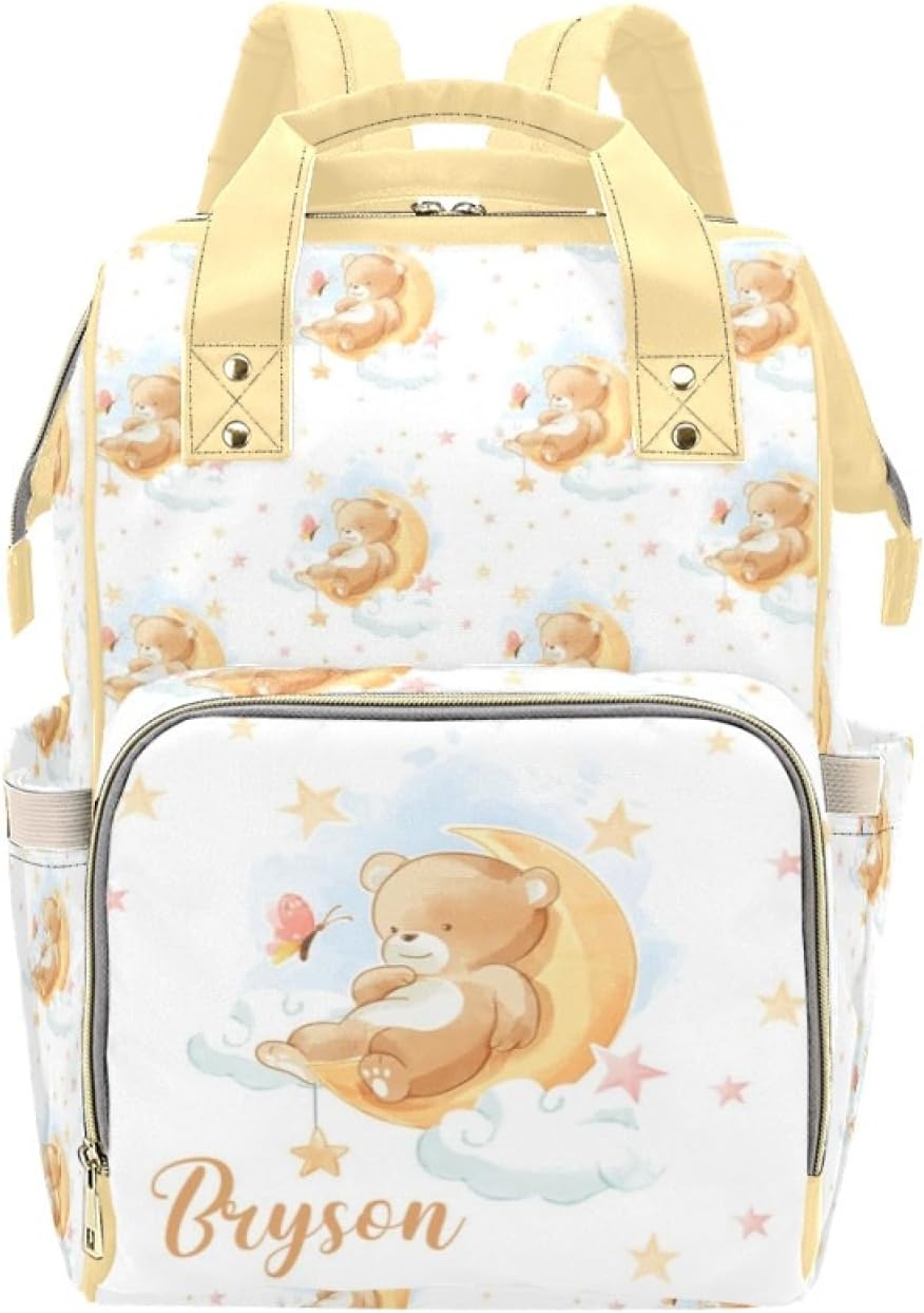 This Personalized Name Diaper Bag offers plenty of storage to fit all of your mom or dad essentials for your baby girl or boy!Material: Made from waterproof nylon.Size: Measures approximately 10.83"(L) x 6.69"(W) x 15"(H) x 3.1"Parts structure: One main capacity pocket, 2 side pockets, 1 front zipper pocket, multi-pocket design, side zipper, easy to take away, spacious and separate bottle design area, easy to use.Multi Color & Design:Cute elements, so you can have one more decoration to decorate your holiday.Multifunction:A mesh pocket featured. Padded back and adjustable shoulder straps for ultra comfort and stability. Multi function backpaks are suitable for many occasions. Zipper closure allows it easy to open and close.Suitable Different Occasions:The custom diaper bag for baby boy girl is fit for many occasions, such as travel, shopping, hiking, camping, work, going out etc.Perfect Gift:You can send the custom diaper bag to your friends who is a new mom, dad. Or send it to your sister, brother, husband, wife, colleague. As a festival holiday gift present on mother's day, father's day, birthday etc.Start Your Customization:1. Choose The Style You Need;2. Click The "Customize Now" Button;3. Upload Any Name