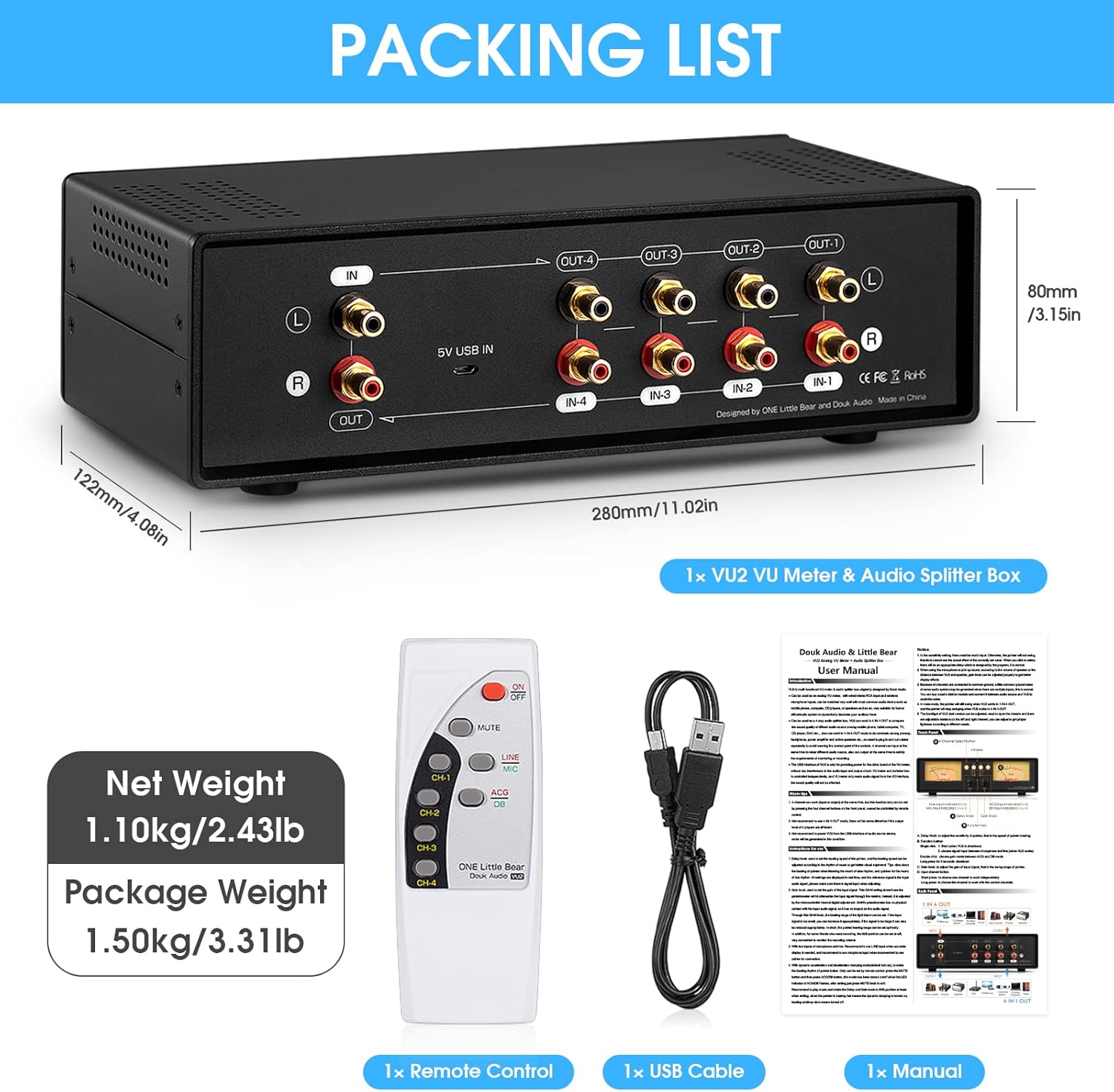 Notice 1. 4 channel can work (input or output) at the same time, but this function only can be set by pressing the four channel buttons on the front panel, cannot be controlled by remote control. 2. When in 4-IN-1-OUT mode, 4 channels of VU2 are not recommended to work in parallel, there will be some distortion if the output level of 4 players are different. 3. Not recommend to power VU2 from the USB interface of audio source device, noise will be generated in this condition. Parameters Audio input: stereo RCA / Microphone Audio output: 4 groups of stereo RCA Working mode of switcher: 1-IN-4-OUT / 4-IN-1-OUT Sensitivity adjustment: support Gain adjustment: support (DB mode / ACG mode) Working voltage: Micro USB DC 5V Working current: 1.5A Voltage of backlight filament: DC / AC 6-12V Current of backlight filament: 100mA Dynamic acceleration / deceleration damping modes: support Power on/off function: support Settings saved after shutdown: support Mute function: support Remote control: support Dimensions(W*D*H): 280*122*80mm / 11.02*4.08*3.15in Net weight: 1.10kg / 2.43lb Package weight: 1.43kg / 3.15lb Packing List 1*VU2 Meter 1*Remote Control (without batteries) 1*USB Cable 1*Manual