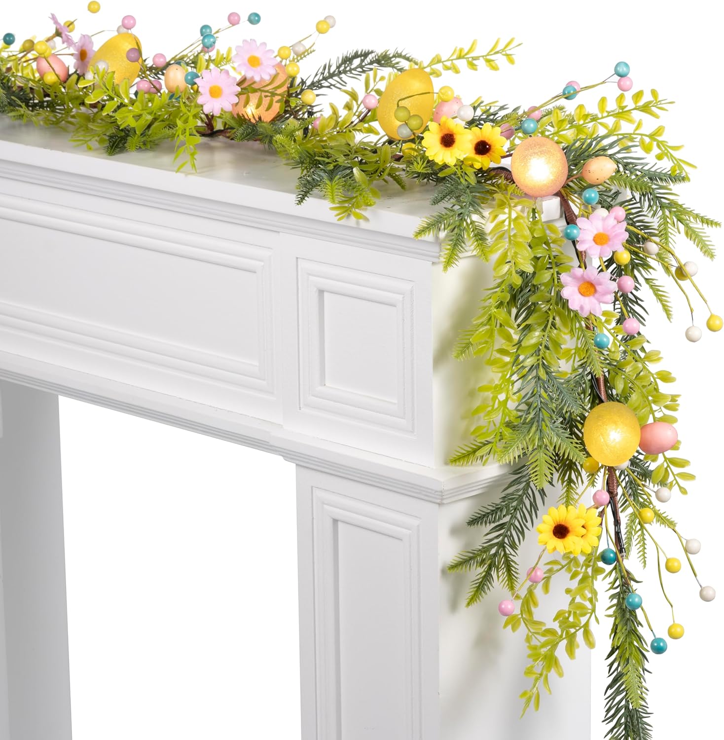 • 🥚【Easter Egg Garland for Mantel, Fireplace & Front Door Decor】This lighted Easter egg garland is designed for mantel, fireplace mantel, front door, doorway, table, and stair railing decor. Flexible and easy to shape, it adds fresh easter charm to indoor and outdoor spaces. Featuring pastel eggs, berries, and eucalyptus, this greenery garland blends farmhouse and vintage Easter decor styles, perfect for Easter home decorations and spring decorating.
