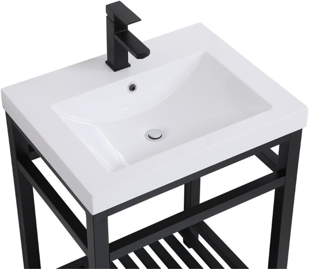 In true minimalistic spirit, this 24" vanity shines with pared down elegance. Bold clean lines build up the metal vanity, creating a modern simplicity that adds visual liveliness and complements any bathroom or powder room. The bottom shelf lets you put away any extra towels or bathroom essentials, and its shining white undermount sink creates contrast against the finish. Its bold graphic style will create a contemporary style in your home.Features:- Finish: Black- Material: Metal, Iron, and Resin- Shape: Rectangle- Vanity Base Finish: Black- Vanity Base Material: Iron- Vanity Countertop Finish: White- Vanity Countertop Material: Resin- Vanity Countertop Edge Style: Flat- Vanity Sink Material: Resin- Free-standing vanity with undermount sink- Faucet Type: Single (Not Included)- Number of Faucets: 1- Shelf Material: Metal- Leg Design: Straight- Room of Use: Bathroom- Vanity base constructed with metal- Overall open minimalistic design with bold clean lines- Rectangle shaped counter top with a flat edge style- White resin undermount sink- Open bottom shelf at base- Free standing vanity with straight legs design- TSCA VI Certification- Drain assembly not includedSpecifications:- Product Dimensions: 34" H x 24" W x 19" D- Product Weight: 47.22 lbs- Shelf Dimensions: 1.125" H x 20.625" W x 15.75" D- Shelf Dimensions: 1.125" Thick- Leg Dimensions: 31.5" H x 1.5" W x 1.5" D- Top Dimensions: 2.36" H x 24" W x 19" D- Product Weight: (Countertop) 23.9 lbs- Product Dimensions: (Sink) 8.25" H x 18.5" W x 11.75" D- Product Dimensions: (Sink Drain Hole) 1.75"- Product Dimensions: (Vanity Faucet Hole) 1.38''"- Product Dimensions: (Vanity Faucet Hole Distance from Countertop Top Edge) 12"- Product Dimensions: (Vanity Faucet Hole Distance from Countertop Side Edge) 2.5"- Product Dimensions: (Sink Drain from Countertop Side Edge) 12"- Number of Shelves: 1- Warranty: 1 Year