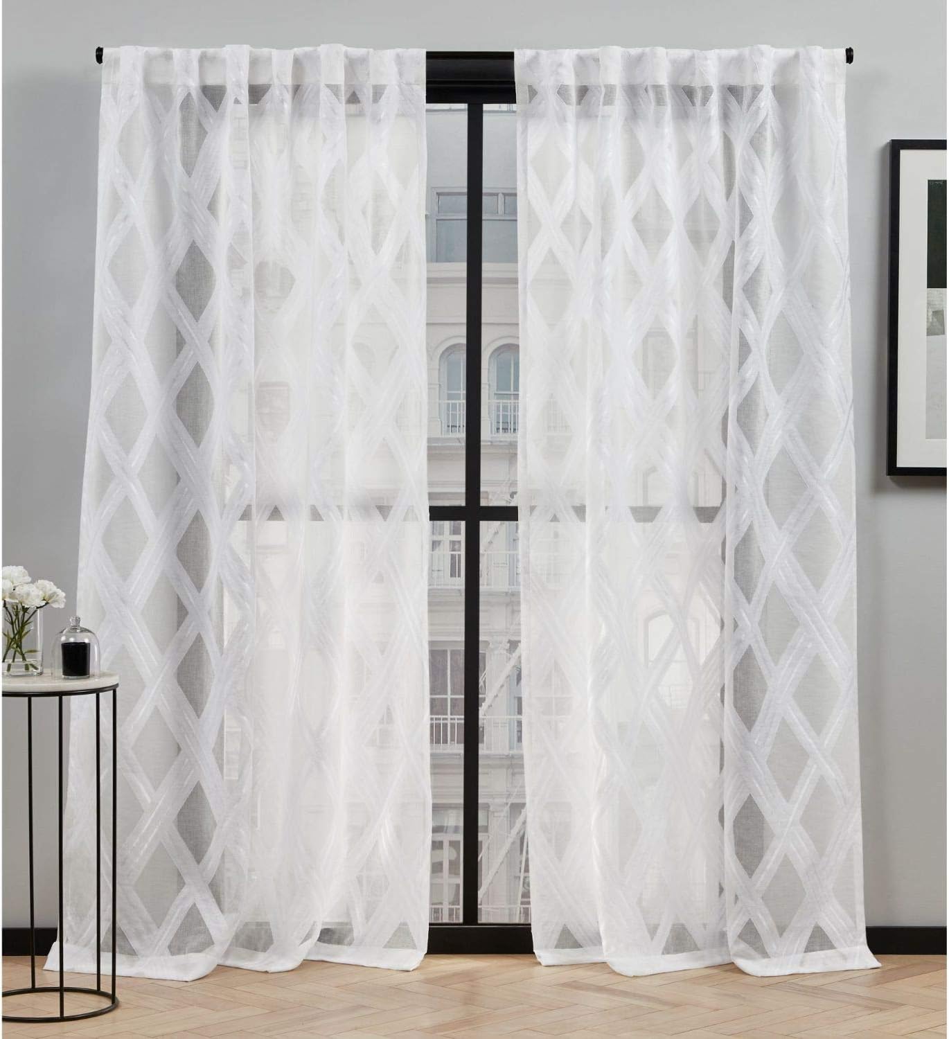 Elevate your decor with the Naomi curtain panels by ELLE DECOR. They feature a diamond clipped sheer pattern that provides modern sophistication while diffusing light beautifully. They can be hung three ways: on a curtain rod up to 1-1/2" diameter using back tabs, the rod pocket, or using clip rings (not included). For proper look and fullness, they should measure 2-3 times the width of your window/opening.