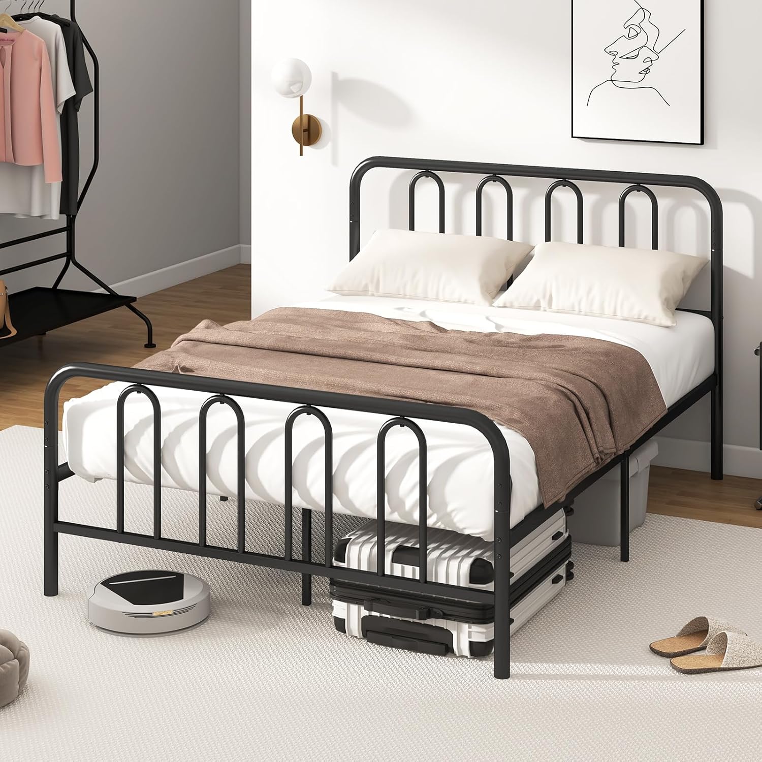 Description:Discover the perfect blend of style, durability, and convenience with our metal platform bed. The modern design features an elegant headboard and footboard with safe rounded corners, enhancing the style and preventing bumps. Built to last, it supports up to 660 lbs and includes 9 sturdy legs for unmatched stability. Say goodbye to sleep interruptions with our special noise-free design, ensuring a serene slumber every night. Need storage? Enjoy 12 inches of under-bed space to declutter your life! Plus, setup is a snap—literally—with easy-to-place slats that support your mattress so well you won't need a box spring! Why wait? Make your sleep space dreamy and organized today!Features:Adorned with U-shaped metal tubes for a contemporary eleganceSafe round corners prevent accidental bumps or scratchesAmple under-bed space makes it convenient for storage and cleaningAccommodating storage boxes, suitcase, shoes, or robot vacuumMetal tubes with firm connection offer a long-lasting constructionSupported by 12 metal slats and 9 legs for unparalleled stabilityNon-slip foot pads protect floor and enhance stabilityEnable you to snap the slats into slots, no need hardware and extra toolsMute bar help reduce friction and squeak soundSpecification:Color: BlackMaterial: MetalFull SizeOverall Dimensions: 78" x 55" x 40" (L x W x H)Bed Platform: 75" x 54" (L x W)Space Between Bed and Ground: 12.5"Footboard Height: 26"Recommended Mattress: 8"-10" FullMaximum Weight: 660 lbsNet Weight: 52 lbs