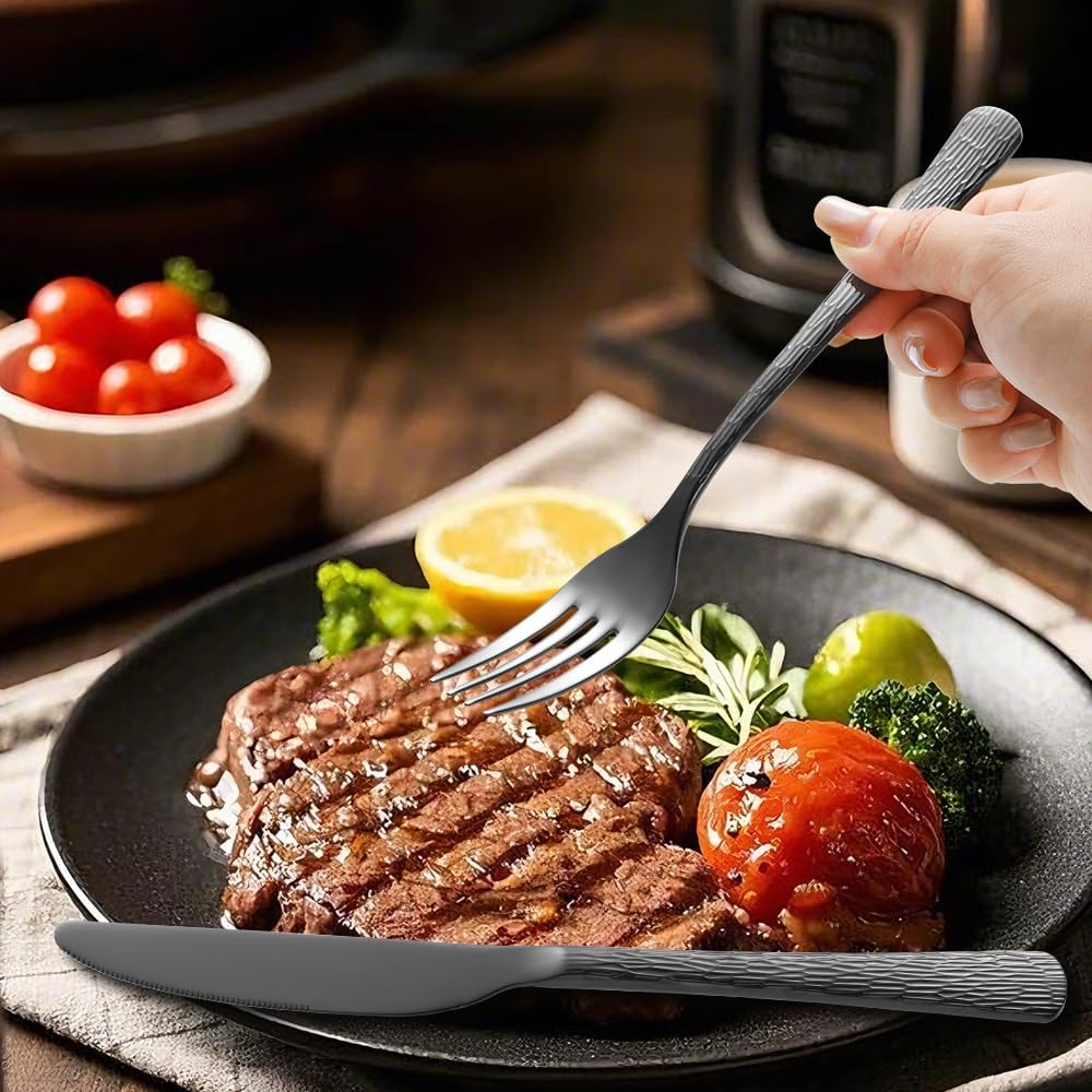Hammered Black Silverware Set, Flatware Set, 18/10 Stainless Steel Premium Cutlery with Unique Ripple Handles Tree Pattern Design Mirror Polished - Dishwasher Safe (20-Piece)