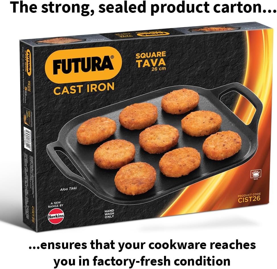 Hawkins Futura Cast Iron Square Tava, is crafted without any coating offering a natural nonstick surface, ensuring delicious and healthier meals. The square shape provides a larger cooking surface area compared to round tavas, allowing to cook larger ingredients like fillets of fish or long vegetables. Square shapes fit better on stovetops, ideal for those with limited kitchen space. The square shape with its corners allows for easier access when flipping or stirring food, especially useful for dishes that require frequent turning. The square shape adds a unique aesthetic appeal to dishes, allowing for attractive plating and presentation. It withstands high heat and retains it efficiently, allowing for easy and quick cooking. With a rugged build, metal ladles can be used without worrying about damaging the surface. Pre-seasoned with vegetable oil, this tava resists rust with regular care. It may be used on gas stoves, in the oven, on a grill, a chulha or on certain induction cooktops.