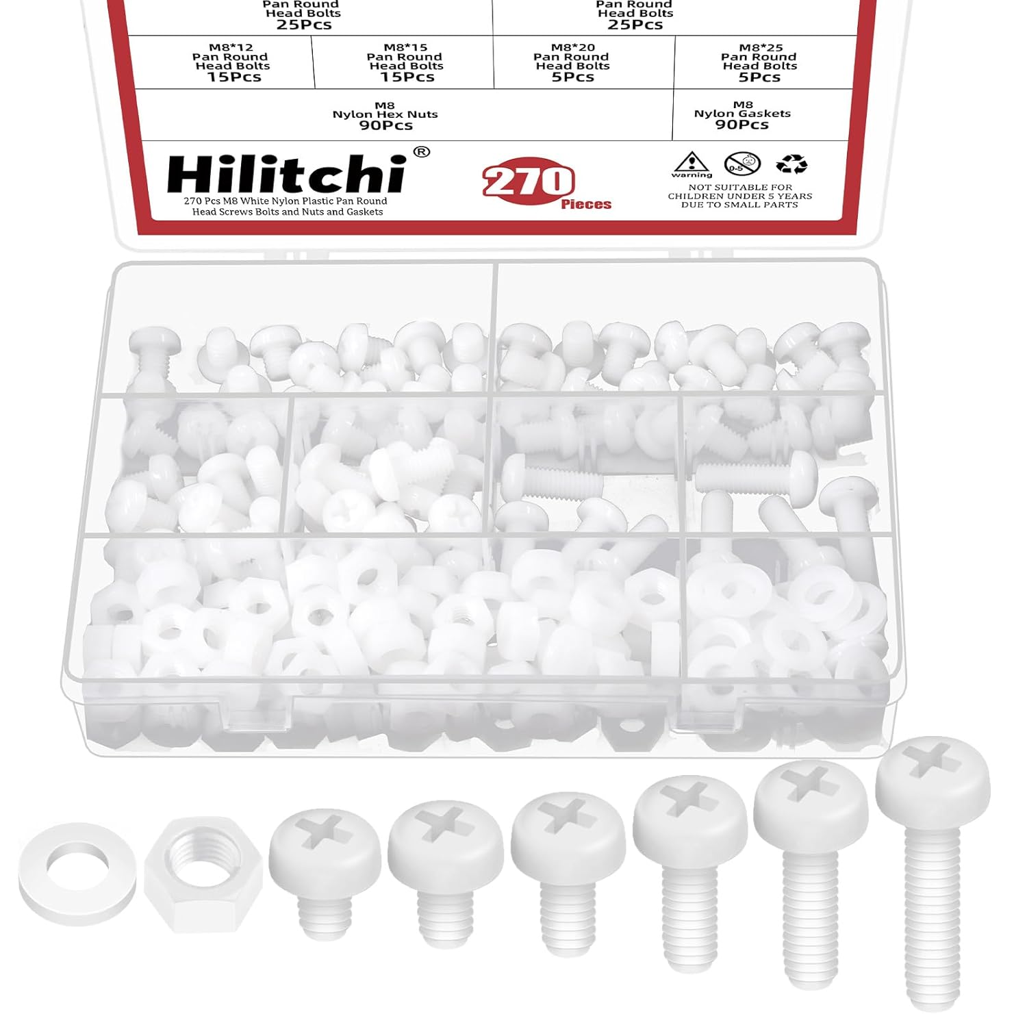 Hilitchi 330Pcs 6Sizes M3 White Nylon Hex Bolts Nylon Hexagon Socket Screw Full Thread Hex Nut Bolt Washer Assortment Kit Plastic Hex Nuts Nylon Screw Nut Assortment for Machinery Electronics Specification: ●Nut Type: Nylon Hexagon Socket Screw ●Material: Nylon ●Nut Sizes: m3 x 4mm, m3 x 5mm, m3 x 6mm, m3 x 8mm, m3 x 10mm, m3 x 12mm. ●Color: White ●Quantity: 330Pcs WHY CHOOSE US? ✔High Quality: Made of high quality nylon material, compact and lightweight, sturdy and durable, with good corrosion resistance. Clear threads, accurate dimensions, and has a long service life. ✔A Practical Kit: Comes with 6 sizes, m3 x 4mm, m3 x 5mm, m3 x 6mm, m3 x 8mm, m3 x 10mm, and m3 x 12mm. Rich size match with nuts and washers of corresponding sizes, bringing convenience to your life. ✔Wide Applications: Widely used in various industrial applications,such as communication equipment, motion sensor installation, controller board construction, etc. Suitable for assembling road bikes, mountain bikes, cars, motorcycles, and ships. 📦Package Included: 30Pcs------- m3 x 4mm white nylon hex bolts 30Pcs------- m3 x 5mm white nylon hex bolts 15Pcs------- m3 x 6mm white nylon hex bolts 15Pcs------- m3 x 8mm white nylon hex bolts 10Pcs------- m3 x 10mm white nylon hex bolts 10Pcs------- m3 x 12mm white nylon hex bolts 110Pcs------- m3 hex nut 110Pcs------- m3 washer Totally 330Pcs