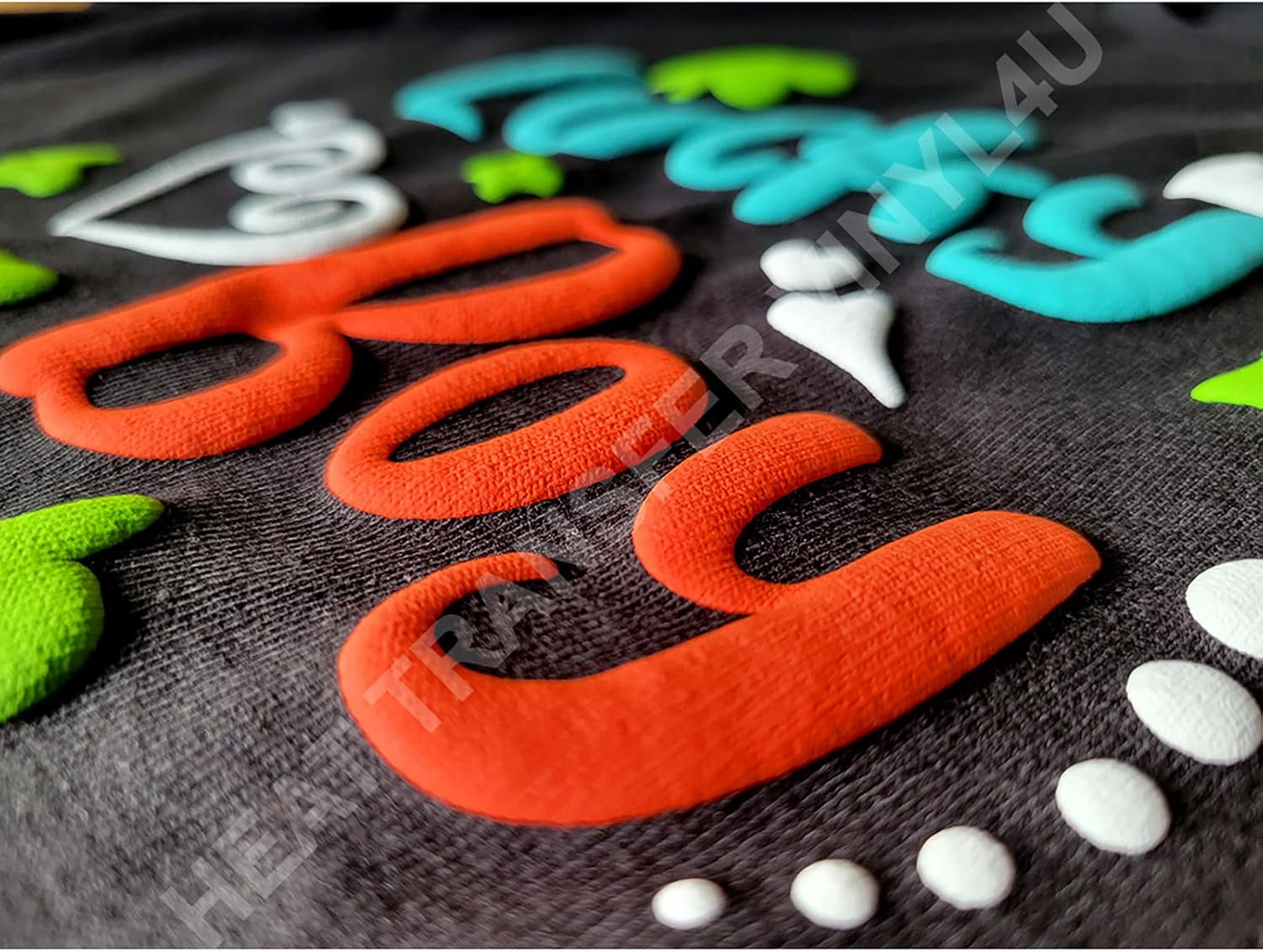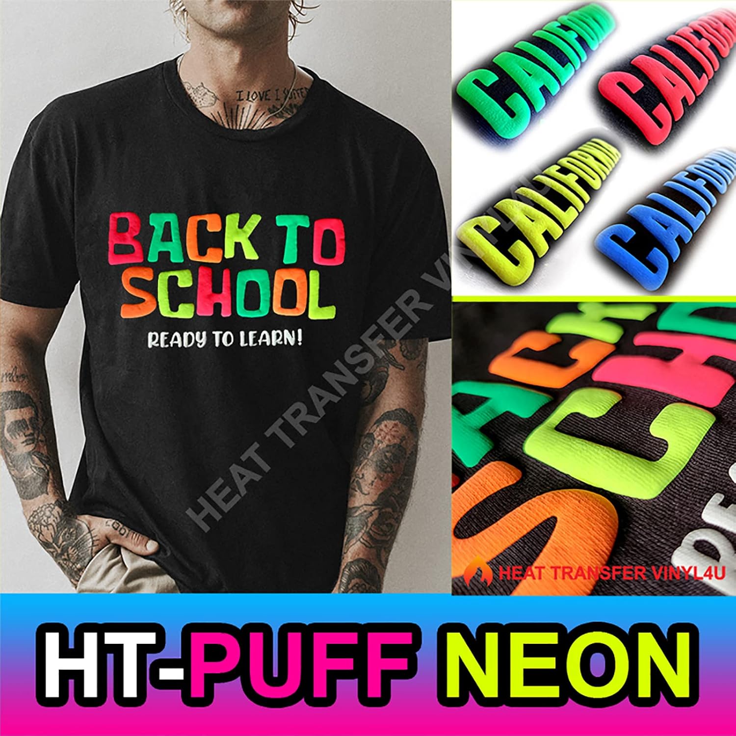 "HT-Puff Try our new HT-Puff Heat Transfer Vinyl for 3D soft puff look! Offering 23 color options, this vinyl puffs up after heat press on your garment. Be as creative as you can be with this fun, innovative vinyl! The puff vinyl will have your finished product with the ""puffed up"" appearance. It will produce a three-dimensional feel and touch to the print. When heat is applied, 3D puffs up to create a unique texture to letters and shapes. It can create an authentic look without using embroidery for the popular retro vintage look. It can be used for numbering uniforms such as baseball, soccer, or basketball or for a wide range of novelty or fashion shirts. Imagine creating special effects for a design with a snowman, clouds, or letters. *If the vinyl doesn't press smoothly down onto the flat surface it may result in some strange wrinkles and indentations. We recommend to test-press before starting your project. **Please consider that the black puff vinyl will turn into dark gray after puffed."