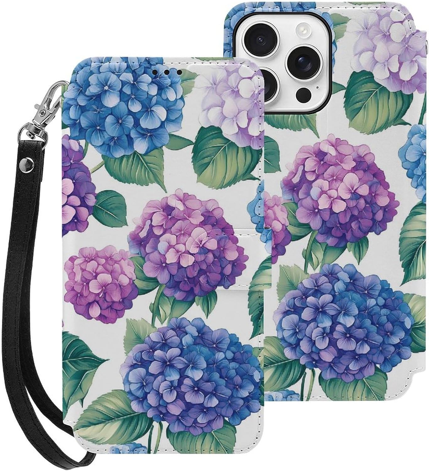 Hydrangeas Flowers Compatible with iPhone 16/16 Plus/16 Pro/16 Pro Max/16 E Case Phone Wallet Card Holder Flip Cover with Wrist Strap