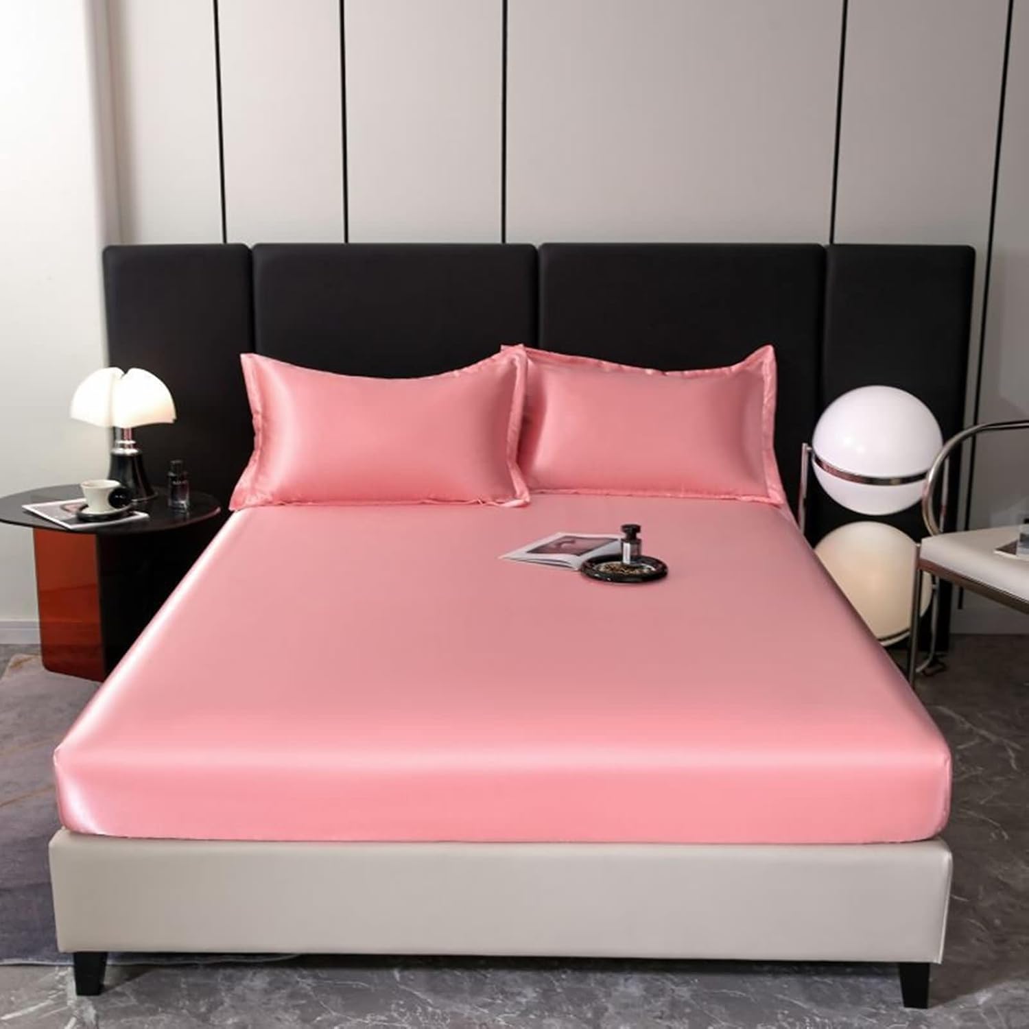 Mesnt fitted sheet is made of strong and durable satin to bring you soft and cosy feel, and maintains the overall brightness and shape of the sheet for years to come. Not only this, this sheet could be cleaned quickly and conveniently through a machine wash.The all-around elastic on the sheet makes it fit easily onto the mattress while giving a nice finished look to the bed which helps to enhance the overall appeal of the room. Give a smooth, finished look to your bed and experience a blissful night's sleep with this fitted sheet in possession.The fitted sheet is available in multiple colors and sizes, allowing you to make the right selection for the perfect fit.PACKAGE INCLUDES1 x Fitted Sheet + 2 x PillowcasesPLEASE NOTEAll sizes are approximate, and it is possible 1 cm โ 5 cm differences due to manual measurement.Due to the screen, light and Image Post-Processing difference, maybe the actual product color is slightly different from the pictures shown on this page.
