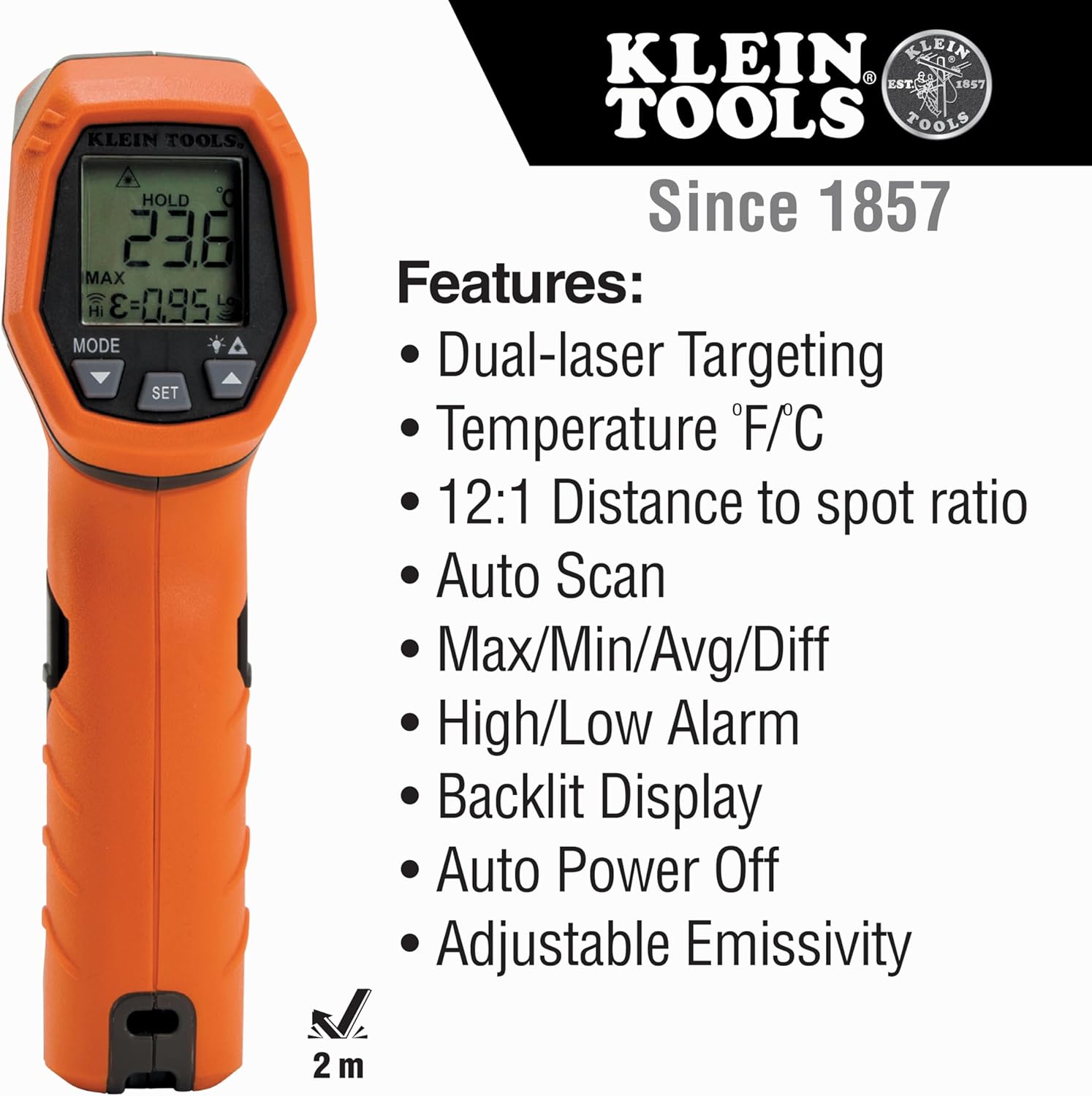 Klein Tools IR5 Dual Laser 12:1 Infrared ThermometerKlein Tools IR5 is a professional dual-laser targeting infrared thermometer, offering a wide measurement range, a tight 12:1 distance-to-spot ratio, dual targeting lasers, and several calculation modes to facilitate different temperature measurement applications. The dual lasers assist in targeting the measurement area. The distance between the two laser spots on the surface of the object being measured approximates the diamater of the circular measurement area from which the infrared sensor is collecting data. Infrared temperature gun measured range of -22 to 752-Degree F. Digital infrared thermometer with dual laser targeting. Laser thermometer not intended for human temperature testing. Uses one 9-volt battery, with battery life expectancy at 10 hours of continuous use with laser and backlight on. Includes custom pouch and batteries. Adjustable emissivity. Soft-touch, over-mold housing. For ambient temperatures above freezing, the accuracy is +/- 4-degrees F or +/- 2-percent; Accuracy below freezing is +/- 4-degrees F plus 0.2 degrees per degree below 32-degrees F. For more than 160 years, Klein Tools has manufactured premium-quality, professional-grade hand tools that deliver the performance, durability and precision needed to get the job done right. Our family of engineers, workers and craftsman continue to put six generations of expertise into every tool we create by using only the highest quality materials, superior workmanship, and keeping manufacturing as close to home as we can. Klein isn't just the name of our company, it's also our family name. And since we're an American company that's family-owned and family-run, you know you can count on us to be here tomorrow. Klein Tools doesn't just make great products, we make great products that stand up to the demands of the professionals who use them every day ... Since 1857.Klein Tools ET140 Pinless Moisture Meter for Non-Destructive Moisture Detection in Drywall, Wood, and Masonry; Detects up to 3/4-Inch Below SurfaceKlein Tools ET140 Moisture Meter is designed to non-invasively detect hidden moisture content up to 3/4-Inch (19 mm) depth. Easily select between materials with mode button to test surface of drywall, masonry, hardwood, and softwood. The ET140 has easy viewing with bright, reverse-contrast display and LED bar graph. Pinless moisture detection in drywall, masonry, hard and softwood. Non-invasive EMF technology detects moisture up to 3/4-Inch deep. Moisture Meter has bright reverse-contrast display to read easily. Hold, Low battery, and Auto-Power off functions. Built to withstand a 6.6 foot (2 m) drop. Includes detector, 9V battery, and instruction manual. For more than 160 years, Klein Tools has manufactured premium-quality, professional-grade hand tools that deliver the performance, durability and precision needed to get the job done right. Our family of engineers, workers and craftsman continue to put six generations of expertise into every tool we create by using only the highest quality materials, superior workmanship, and keeping manufacturing as close to home as we can. Klein isn't just the name of our company, it's also our family name. And since we're an American company that's family-owned and family-run, you know you can count on us to be here tomorrow. Klein Tools doesn't just make great products, we make great products that stand up to the demands of the professionals who use them every day ... Since 1857.