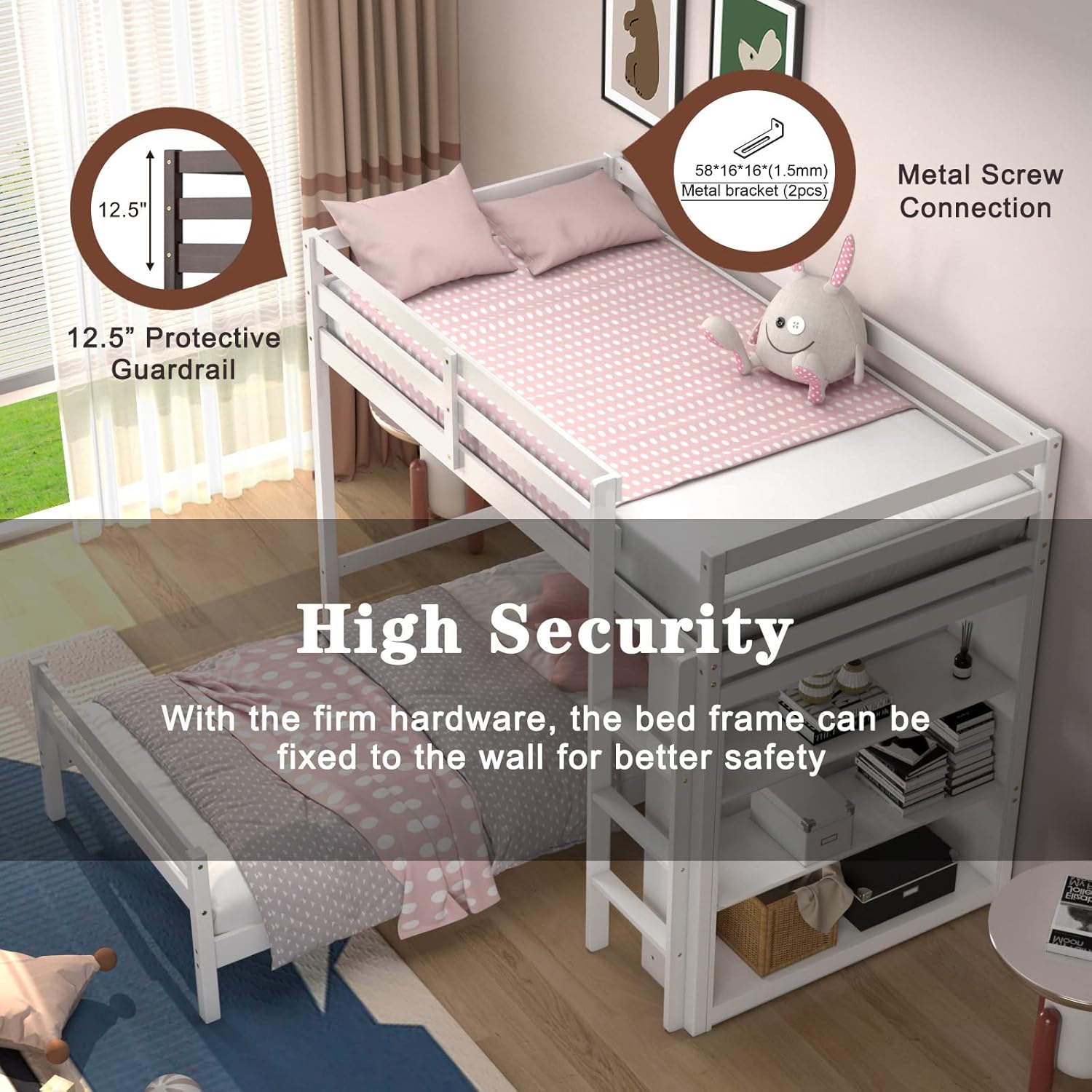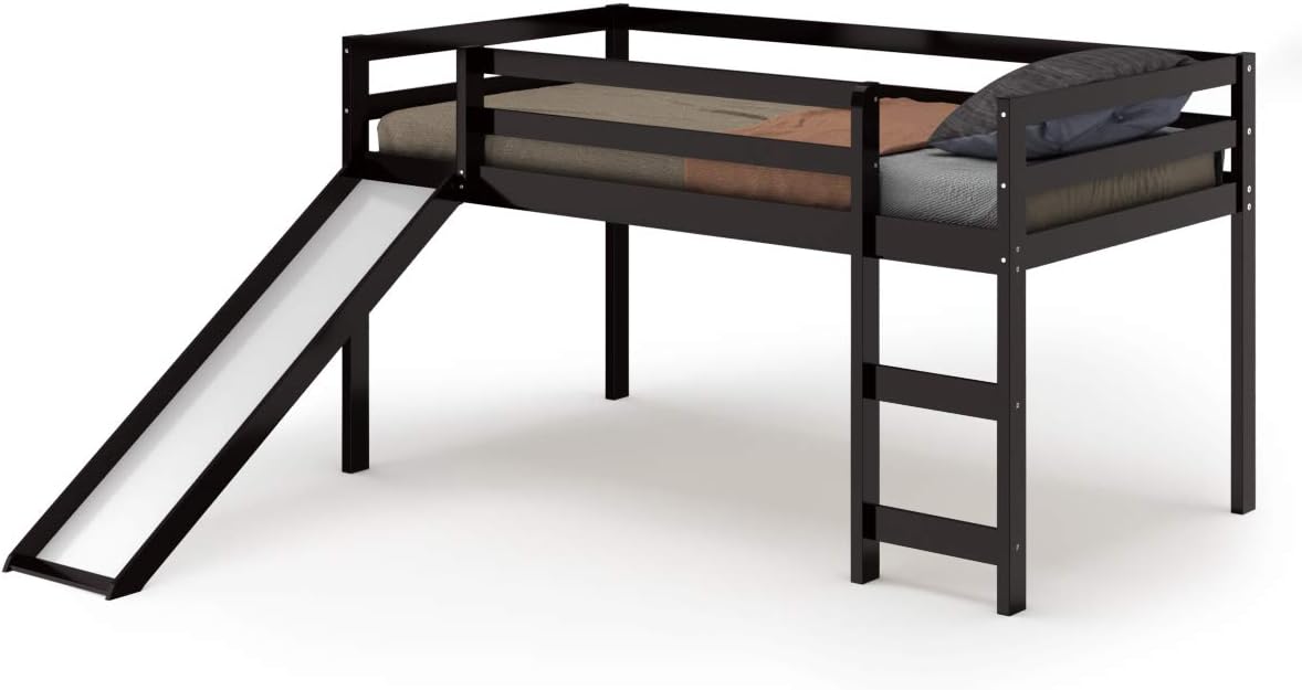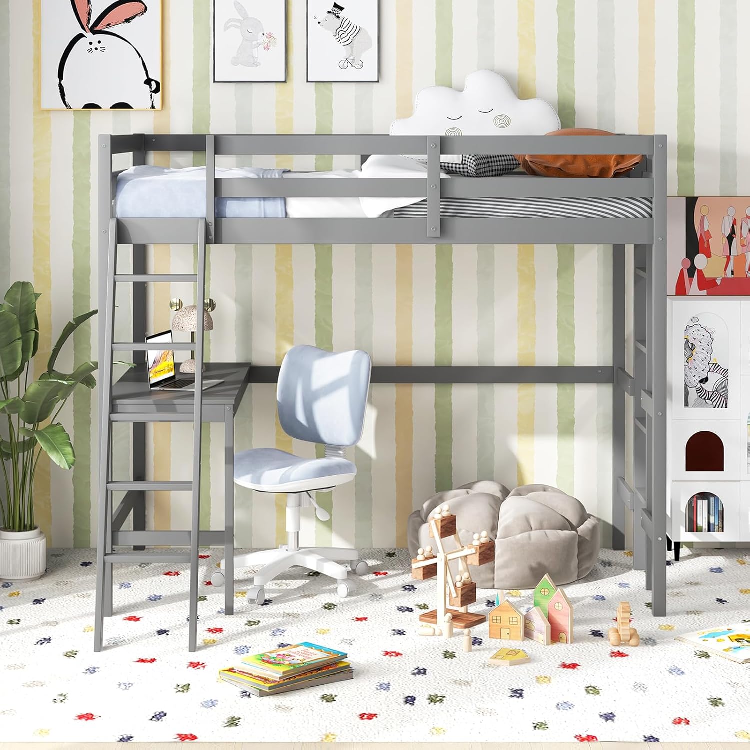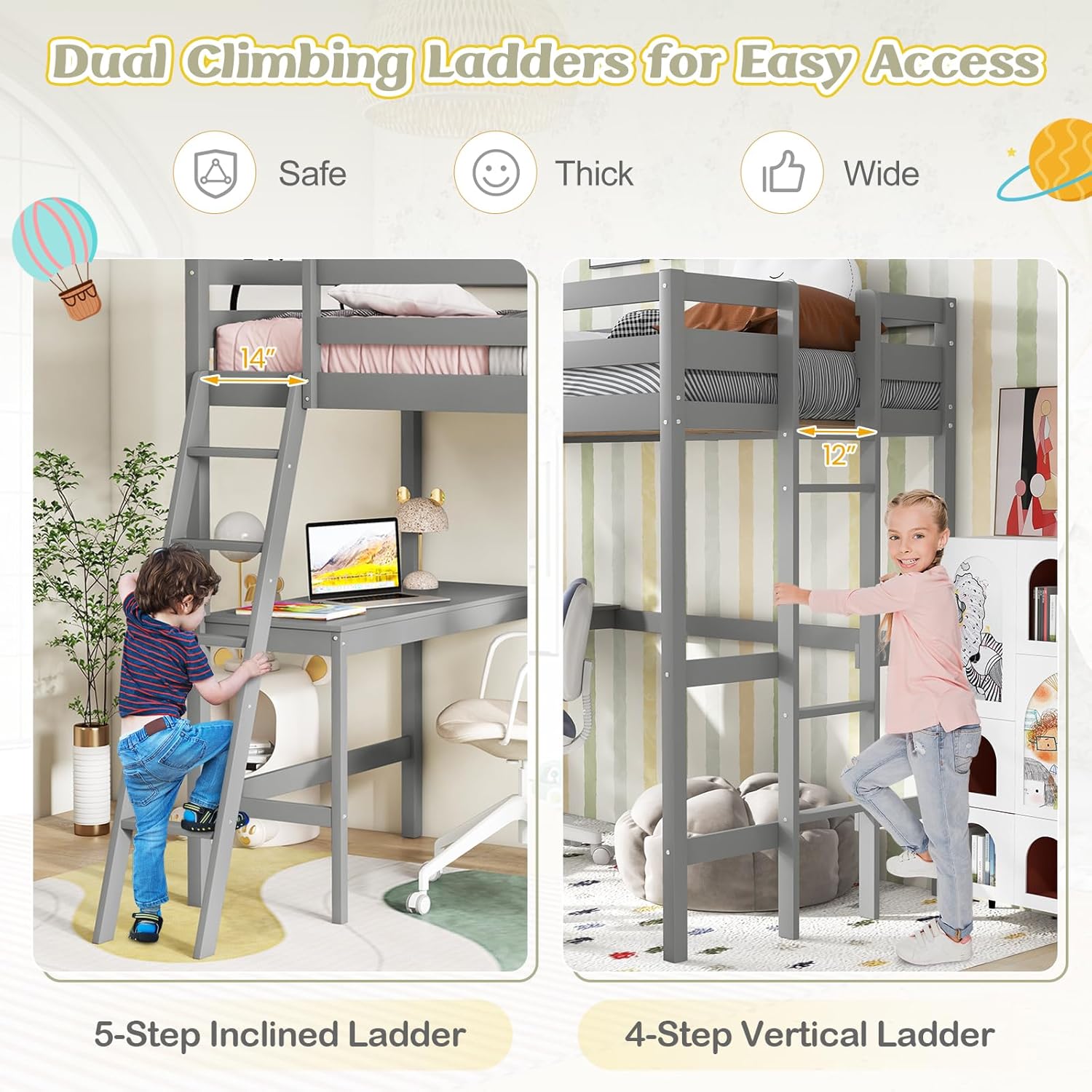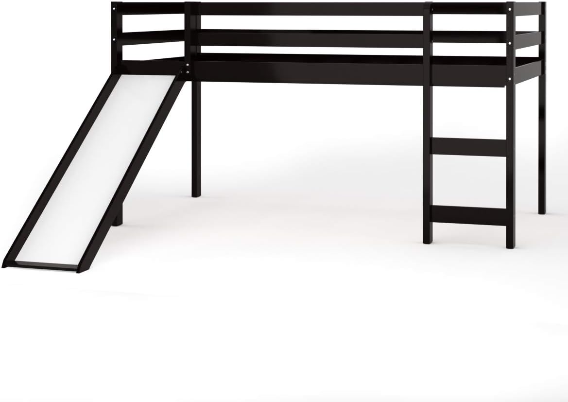 Enhance your child’s bedroom with this durable and space-efficient loft bed, which boasts a stable frame made from solid wood, offering a total weight capacity of up to 1525 lbs for ultimate peace of mind. Its 11” high guardrails provide unparalleled safety, and the included anti-tip kit ensures the unit remains securely in place. A built-in study desk below the sleeping area transforms it into an instant productivity nook. For ease of access, the bunk bed features 2 ladder options: a gently sloped ladder for a comfortable climb and a space-saving straight ladder. The loft bunk bed’s platform base is designed to support a twin mattress up to 6 inches thick, removing the requirement for a box spring and fostering a sleek look. Surface of mattress must be at least 5” below the upper edge of the guardrail. Looking forward to you discovering more premium details!