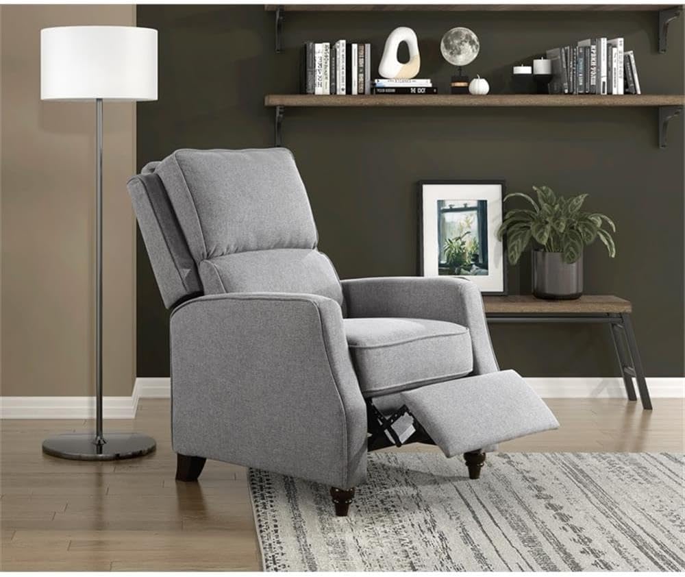 With a transitional style that complements myriad home aesthetics, the Loveland Collection provides comfort and function for your personal space. The recliner eases into the prone position with motion that is initiated by your push. Textured fabric upholstery covers the push back recliner, its gray hue providing neutral complement to your home’s existing décor. Support for the chair comes in the form of the dark brown finished turned wood legs.Features:- Material: Solid wood, plywood, fabric- Finish: Gray- Textured fabric upholstery- Attached back and seat cushions- Solid wood feet in dark brown finish- Push-back/self-reclining motion- Removable seat back- Solid wood and plywood frame with metal reinforced seat- Foam padding over pocket coilsSpecifications:- Product Dimensions: 42"H x 29.5"W x 37"D- Product Weight: 63.25 lbs- Seat Dimensions: 20"H x 21"W x 21"D- Arm Height: 24.5"- Weight Capacity: 300 lbs