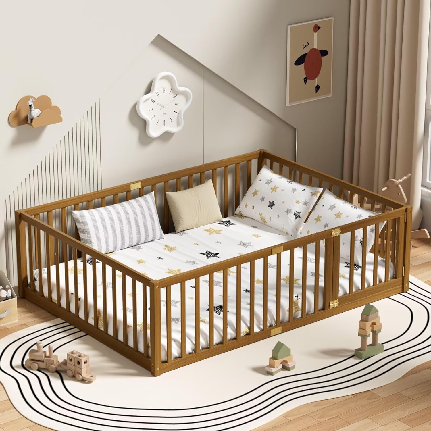 This floor bed creates a safe space for your child to sleep and play.Twin Size:77.9"*40.1"21.6"(inch)