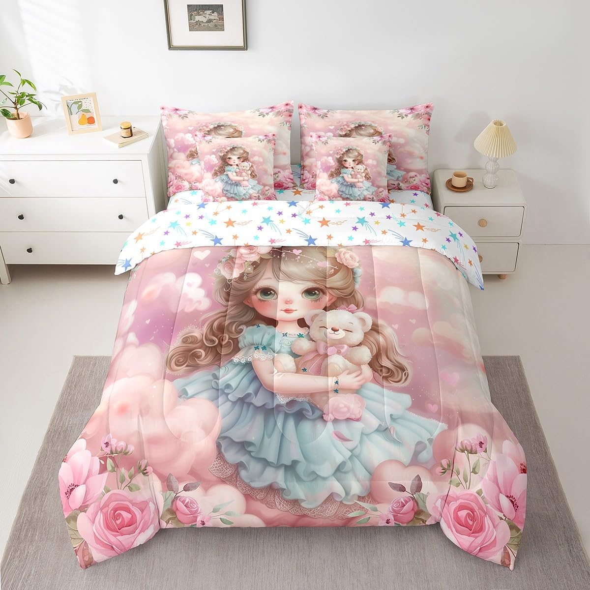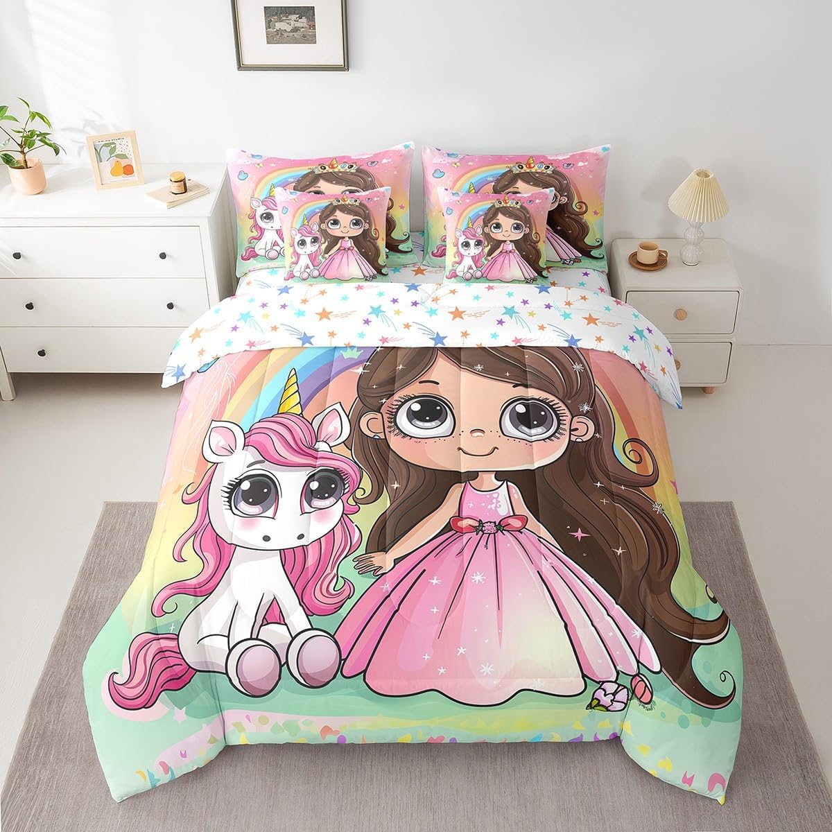 Welcome to our store. We have specialized in home textile for many years. We are contribute to provide the best customer service and products. We'll try our best to answer your questions and solve your problems. Size information: Twin size: 1 Down Comforter 68"W x 90"L, 1 Fitted Sheet 39"W x 75"L x 16"H, 1 Flat Sheet 67"W x 96"L, 2 Pillowcases 20" x 30", 2 Throw Pillow Covers 18" x 18" Full size: 1 Down Comforter 79"W x 90"L, 1 Fitted Sheet 55"W x 75"L x 16"H, 1 Flat Sheet 81"W x 96"L, 2 Pillowcases 20" x 30", 2 Throw Pillow Covers 18" x 18" Queen size: 1 Down Comforter 90"W x 90"L, 1 Fitted Sheet 60"W x 80"L x 16"H, 1 Flat Sheet 90"W x 102"L, 2 Pillowcases 20" x 30", 2 Throw Pillow Covers 18" x 18" King size: 1 Down Comforter 104"W x 90"L, 1 Fitted Sheet 78"W x 80"L x 16"H, 1 Flat Sheet 90"W x 106"L, 2 Pillowcases 20" x 36", 2 Throw Pillow Covers 18" x 18" Useful and practical: A luxurious product for homes,dorm rooms,hotels,guest rooms. Practical to use for being polyester, feels like cotton which is super soft and breathable. No chemicals used, no dye substance harming the health of you or your family. Unique design: Vivid Colors won't fade thanks to new 3D digital printing methods. These unique designs match well with various color palettes of your rugs, curtains, headboard, furniture, and all other decor accessories. Washing instructions: Machine wash separately in cold water,hang dry, do not bleach.