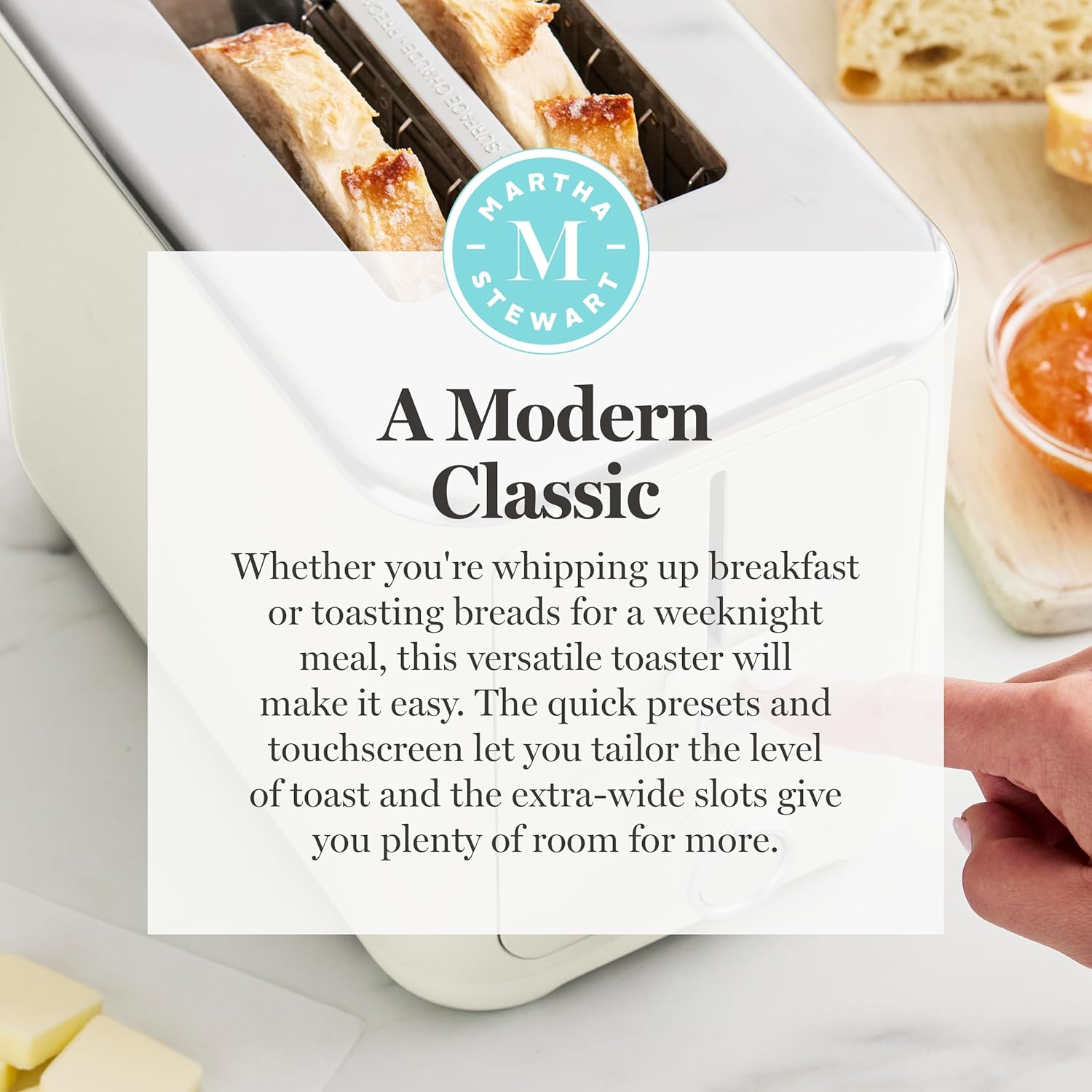 From busy weekday mornings to weekend feasts, the Martha 2-Slice Touchscreen Toaster makes every slice perfectly toasted. The intuitive touchscreen and smart presets let you control browning, while extra-wide slots fit thick-cut bread, bagels, waffles, and more. The 10-setting shade dial and shade memory ensure consistent results every time, while the self-centering slots hold bread in place for even toasting. Thoughtful design touches like a removable crumb tray, cool-touch control panel, integrated cord wrap, and anti-slip feet make cleanup simple and keep your countertop safe. Powered by a 900-watt heating system, this toaster combines speed, efficiency, and versatility in a sleek, modern package.