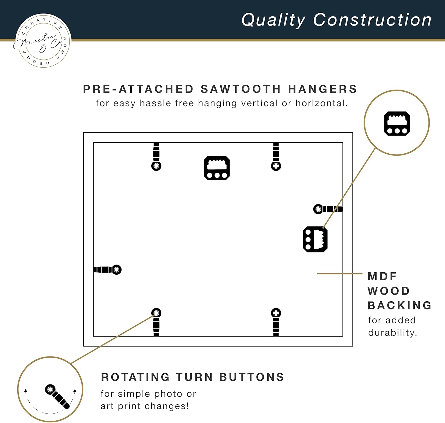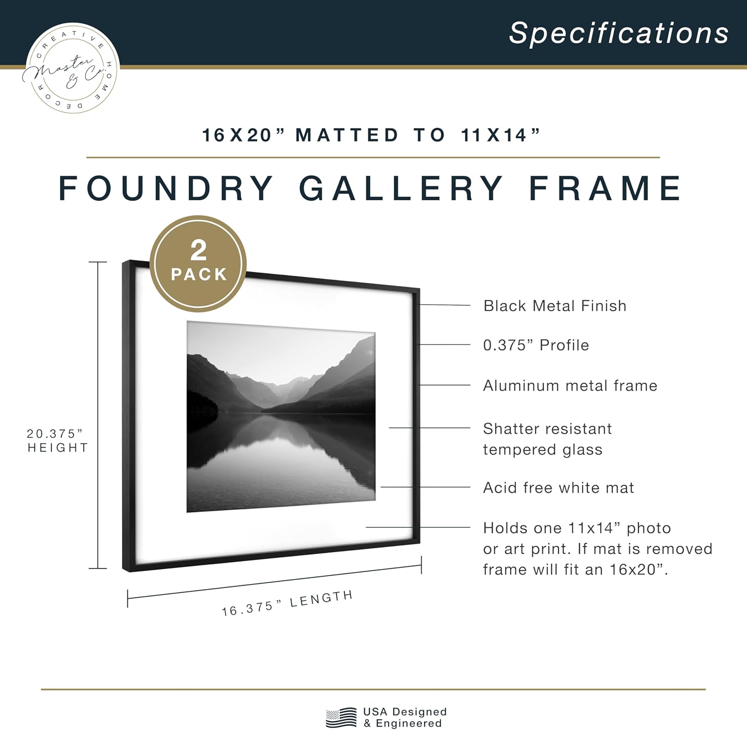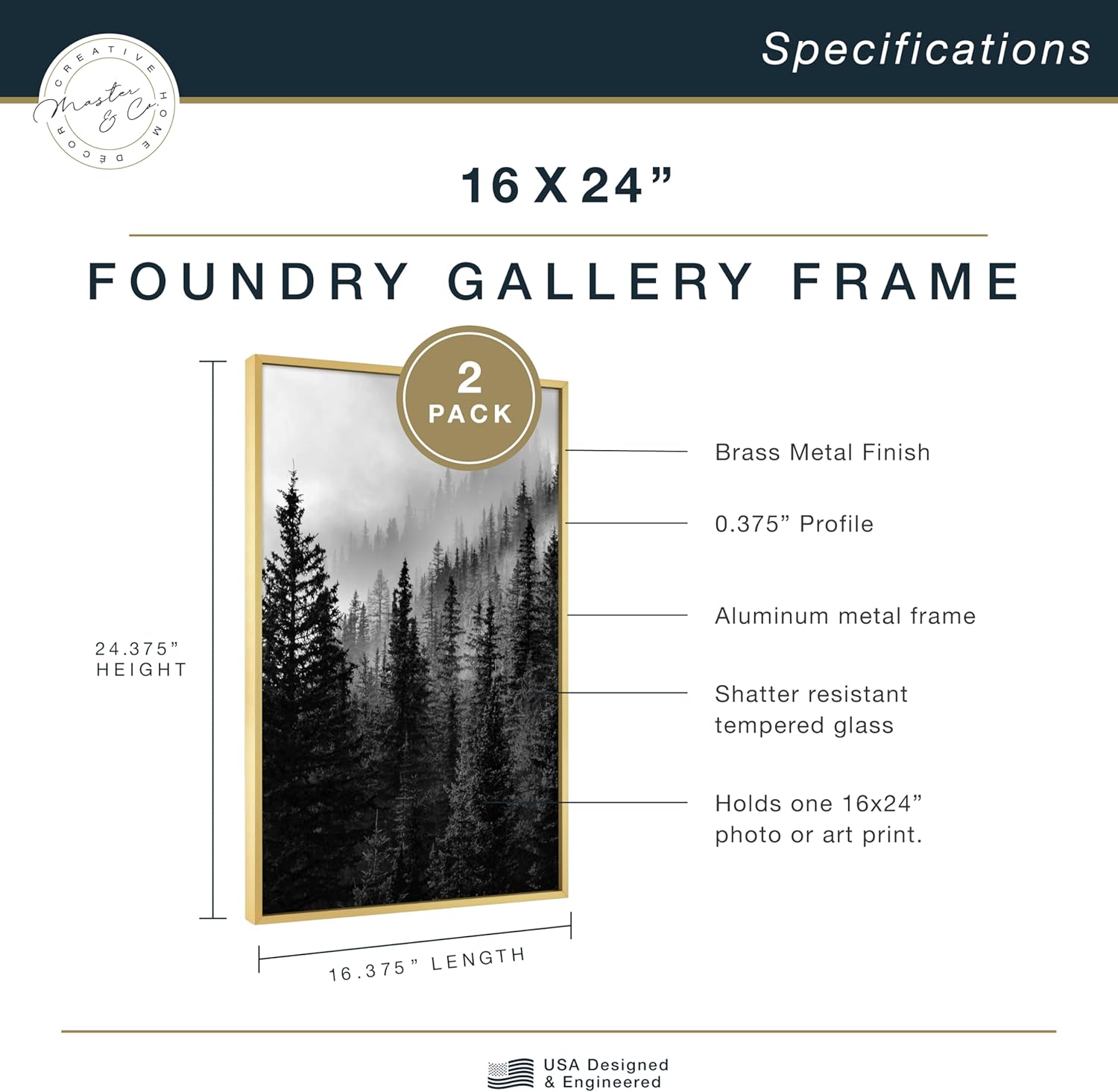 The MCS 18x24 inch Foundry Gallery Wall Frame is a modern and sophisticated display for photographs or artwork. The frame is crafted of aluminum, and features a contemporary brass finish with linear brushing that gives this frame a luxurious look. The front of the frame features shatter resistant glass which helps prevent breakage. Easily add your photo or artwork using the easy to use turn buttons. Hanging is a breeze, with the attached saw tooth hangers for vertical or horizontal wall hanging. The frame is designed to feature a 18x24 inch photograph or art print. Pair this frame with other sizes or finishes in this collection for that show stopping gallery wall you've been dreaming of.