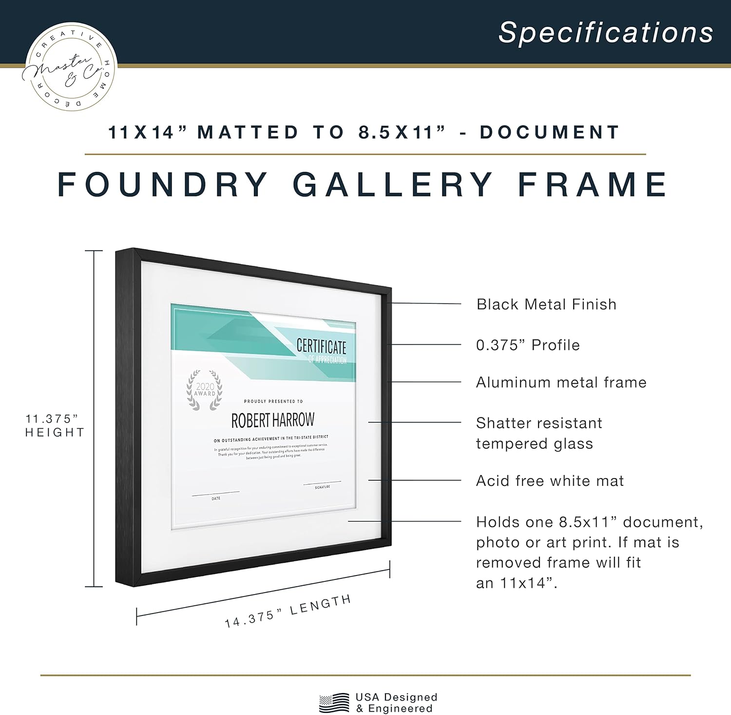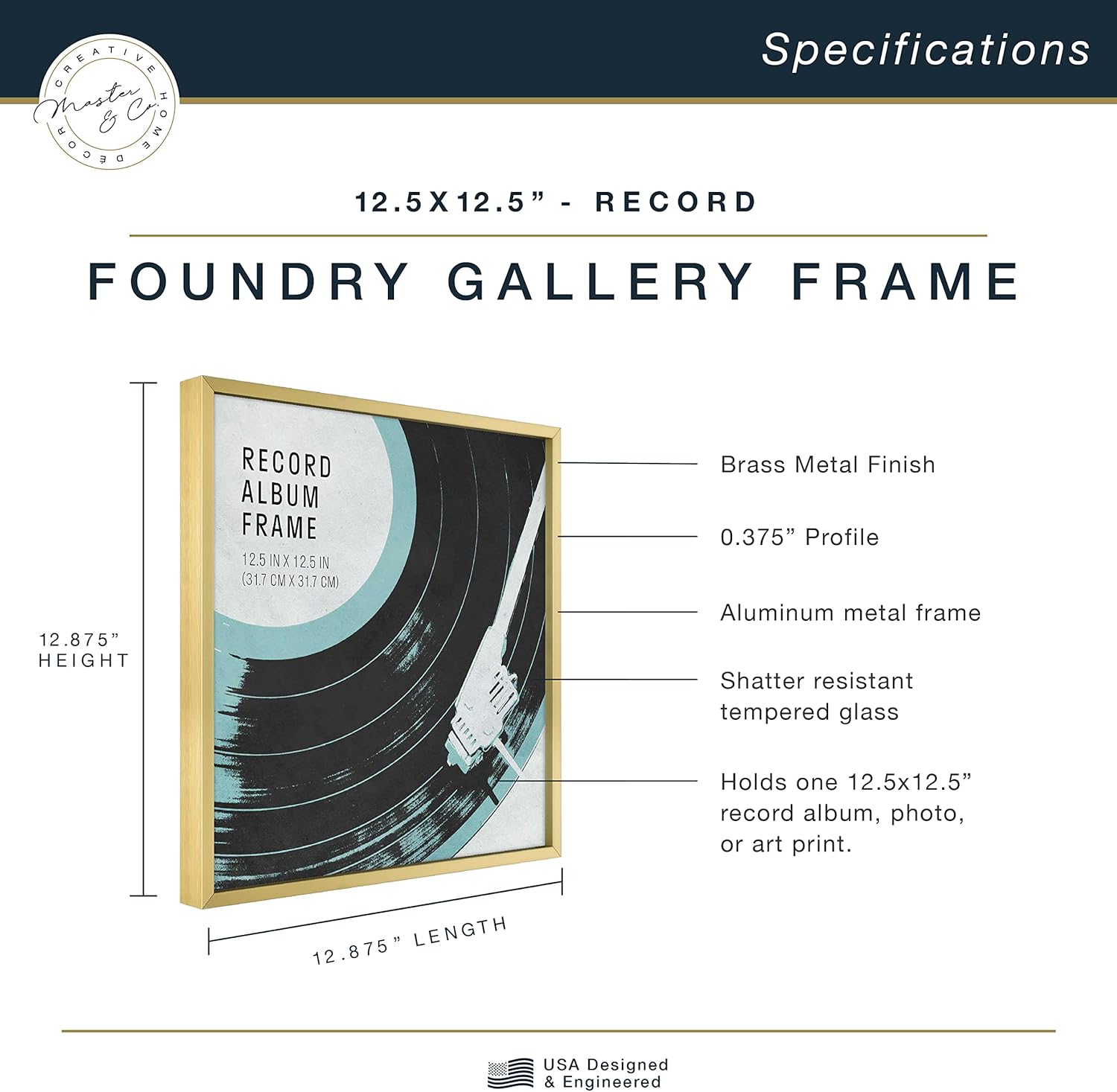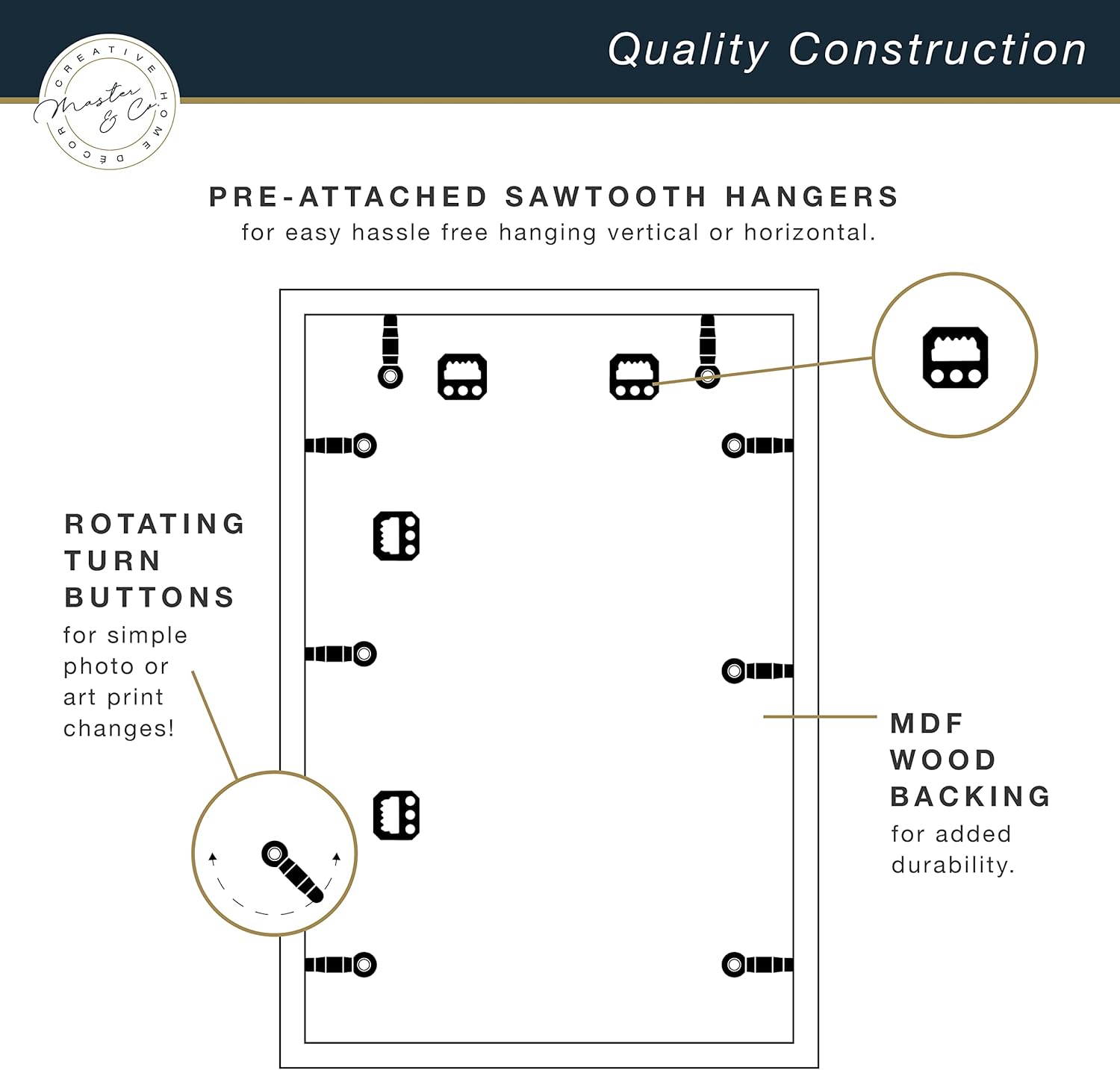 The MCS 18x24 inch Foundry Gallery Wall Frame is a modern and sophisticated display for photographs or artwork. The frame is crafted of aluminum, and features a contemporary brass finish with linear brushing that gives this frame a luxurious look. The front of the frame features shatter resistant glass which helps prevent breakage. Easily add your photo or artwork using the easy to use turn buttons. Hanging is a breeze, with the attached saw tooth hangers for vertical or horizontal wall hanging. The frame is designed to feature a 18x24 inch photograph or art print. Pair this frame with other sizes or finishes in this collection for that show stopping gallery wall you've been dreaming of.