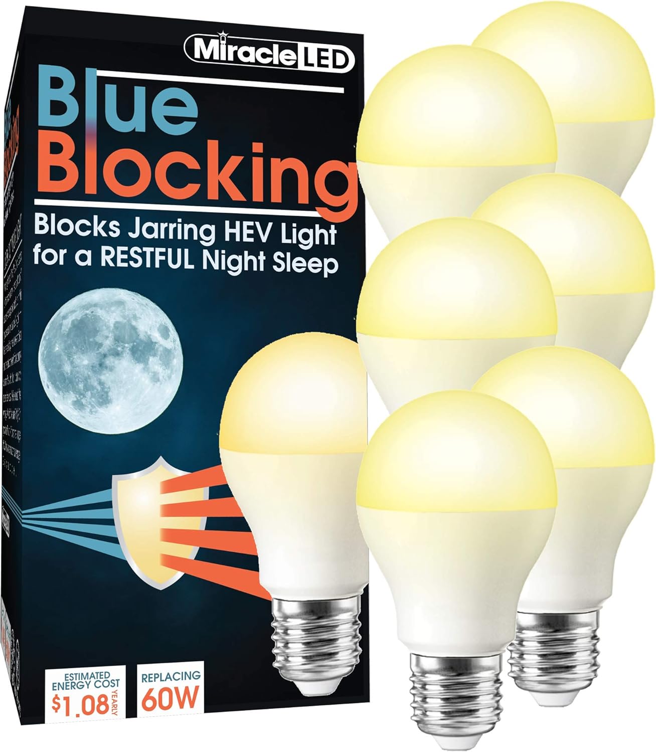 MiracleLED has spent years developing the perfect UV blocking amber glow of the blue blocking bedtime light. Blue ultra-violet light is jarring and naturally produced by the sun to get us up and awake for the day, making it unhealthy to our sleep cycle when exposed to at night, when we should be sleeping. Your circadian clock (your sleep/wake cycle) has been perfected over thousands of years, to daily sunrise and sunset. With the MiracleLED blue blocking light, simulate a sunset every night with a gorgeous, Soothing Amber light built right into the LED that looks, and feels better than old, luminescent yellow painted bulbs and emits no blue light, as well as saving up to $49 a year on energy costs with our groundbreaking LED technology. Blocking out blue light can help prevent sleep disorders, help get you ready for bed, and help prevent migraines. Cut out the blue light and give your system a chance to create melatonin naturally. Blue Blocking series is designed for you to study your own relaxing areas with bulbs that inhibit blue spectrum light. Blue Blocking bulbs are NOT replacements for actual medical procedures or tests. They are not meant to treat medical conditions of people that find trouble sleeping. These bulbs only remove the presence and emission of blue spectrum HEV light within the light.