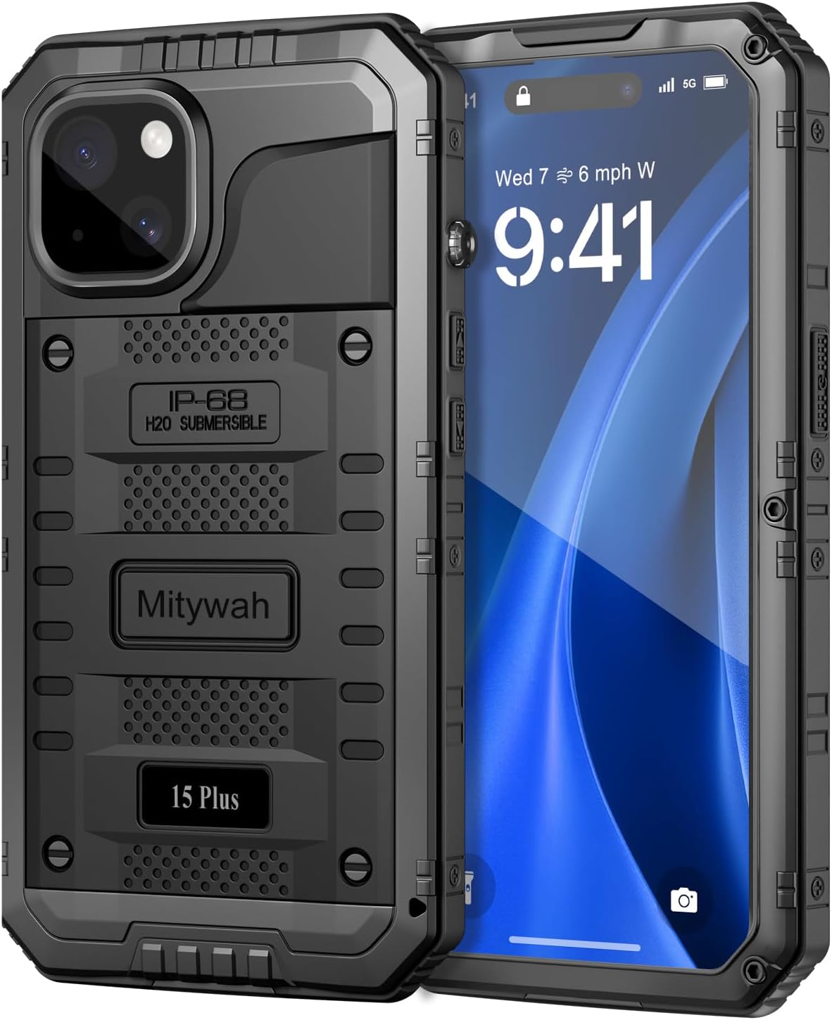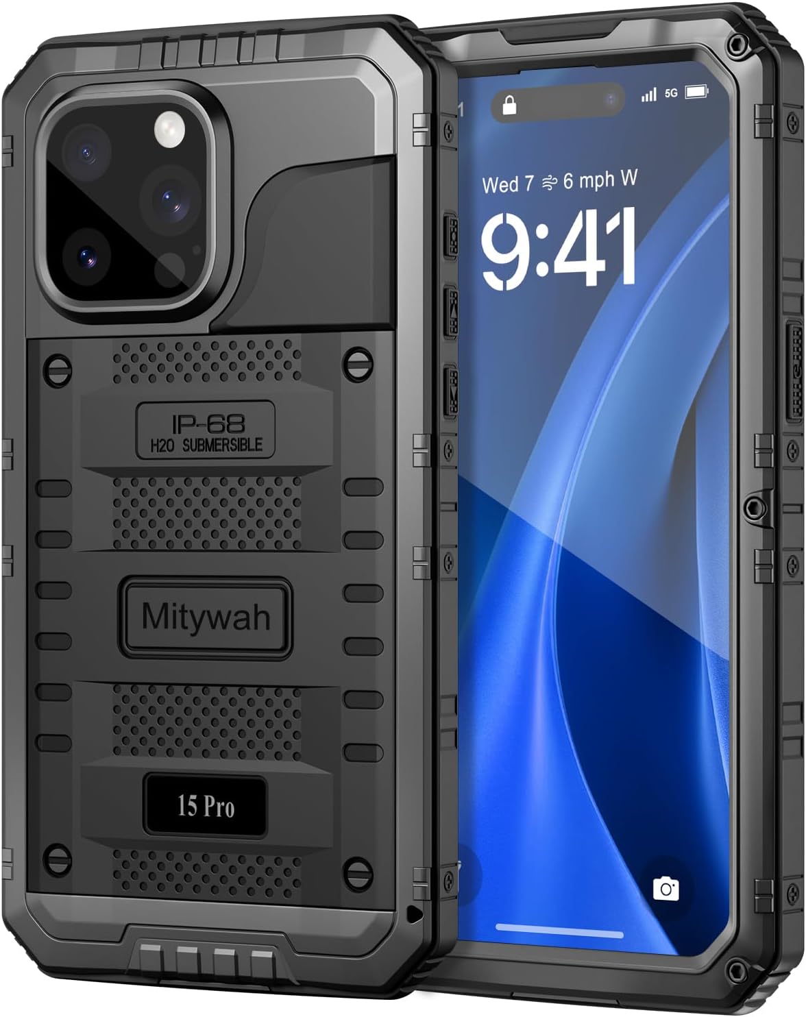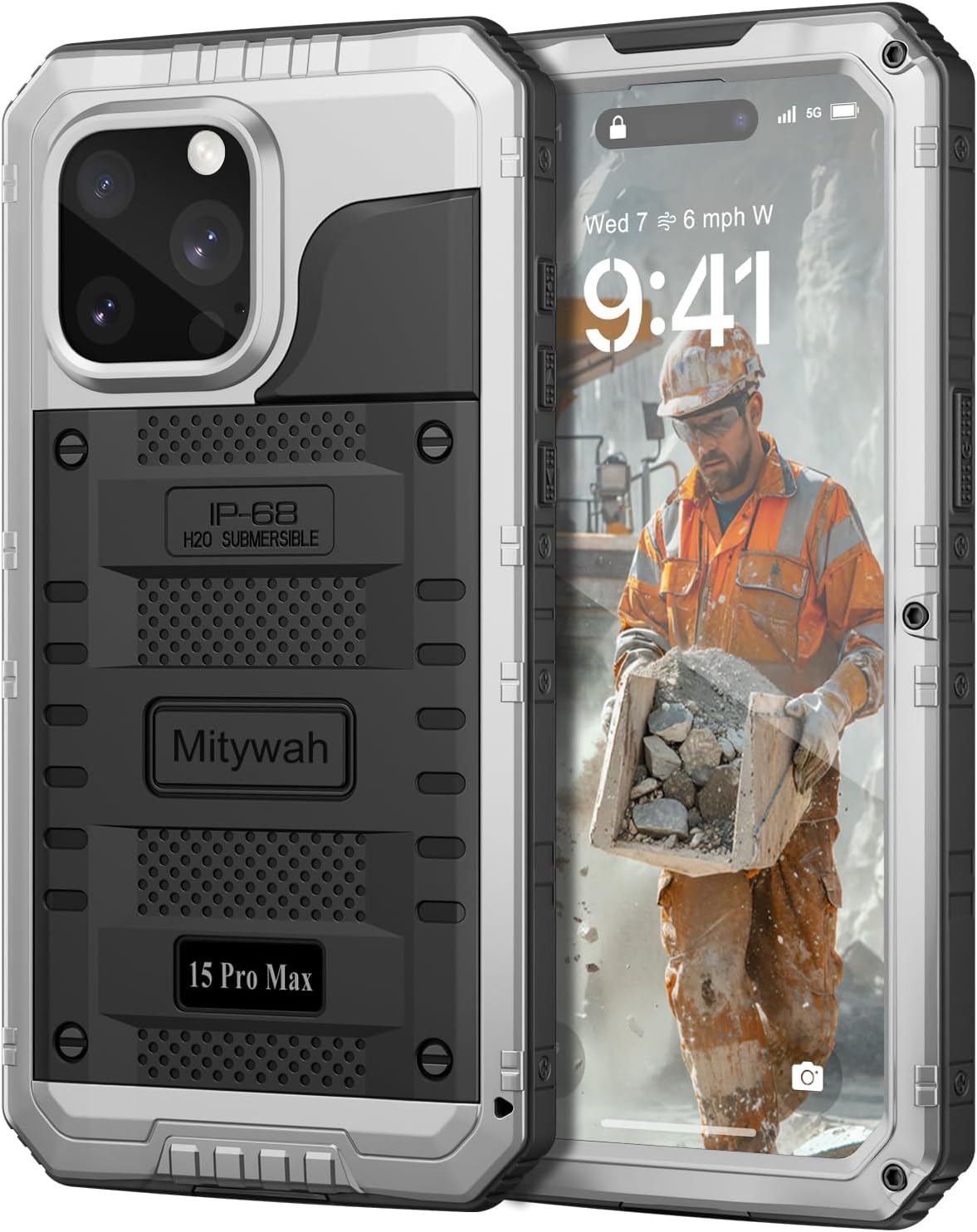 Destroyed your last phone on a fishing trip? This waterproof case for iPhone 15 Pro Max surrounds your phone in a sealed metal frame and silicone armor—thick, heavy-duty protection that lets you shoot crystal-clear underwater photos without flinching. STOP choosing between protection and performance. Our IP68-rated case survives 6.6ft underwater for 1 hour—certified for diving, snorkeling, and underwater photography. MILITARY-GRADE DROP DEFENSE → Tested from 14ft onto concrete. Corner TPU shock absorbers compress on impact, shielding your device from construction site drops and mountain biking crashes. Metal frame deflects direct hits; silicone back dissipates remaining force. FULLY SEALED & SUBMERSIBLE → Waterproof, dustproof, snowproof, sandproof. The embedded screen protector blocks grit at the beach; gasket-sealed charging port locks out mud on ATV trails. Take it sand duning or snowmobiling—your phone stays dry.HEAVY-DUTY→ That's how it survives oil rigs and fishing boat decks. Precision-cut buttons preserve the Action Button and mute switch; wireless charging and MagSafe still function.DETACHABLE LANYARD → Clip the included hand strap when kayaking—drop your phone overboard and it dangles safely. Remove it for daily construction work; the choice is yours.▶ WATER SPORTS & FISHINGSecure the lanyard, dive into 6.6ft depths, and record underwater video of your trophy catch. Beach-goers flush saltwater off the sealed ports; poolside parents snap photos mid-cannonball without panic.▶ OUTDOOR ADVENTURESMount it on your dirt bike handlebars—dust can't penetrate the gasket seals. Hike through desert sand or alpine snow; Hunters in tree stands, rock climbers at belay stations—your phone survives the same abuse you do.▶ INDUSTERIAL WORK SITESOil field workers drop phones from drilling platforms; construction crews kick them across rebar-littered floors. This case handles both.