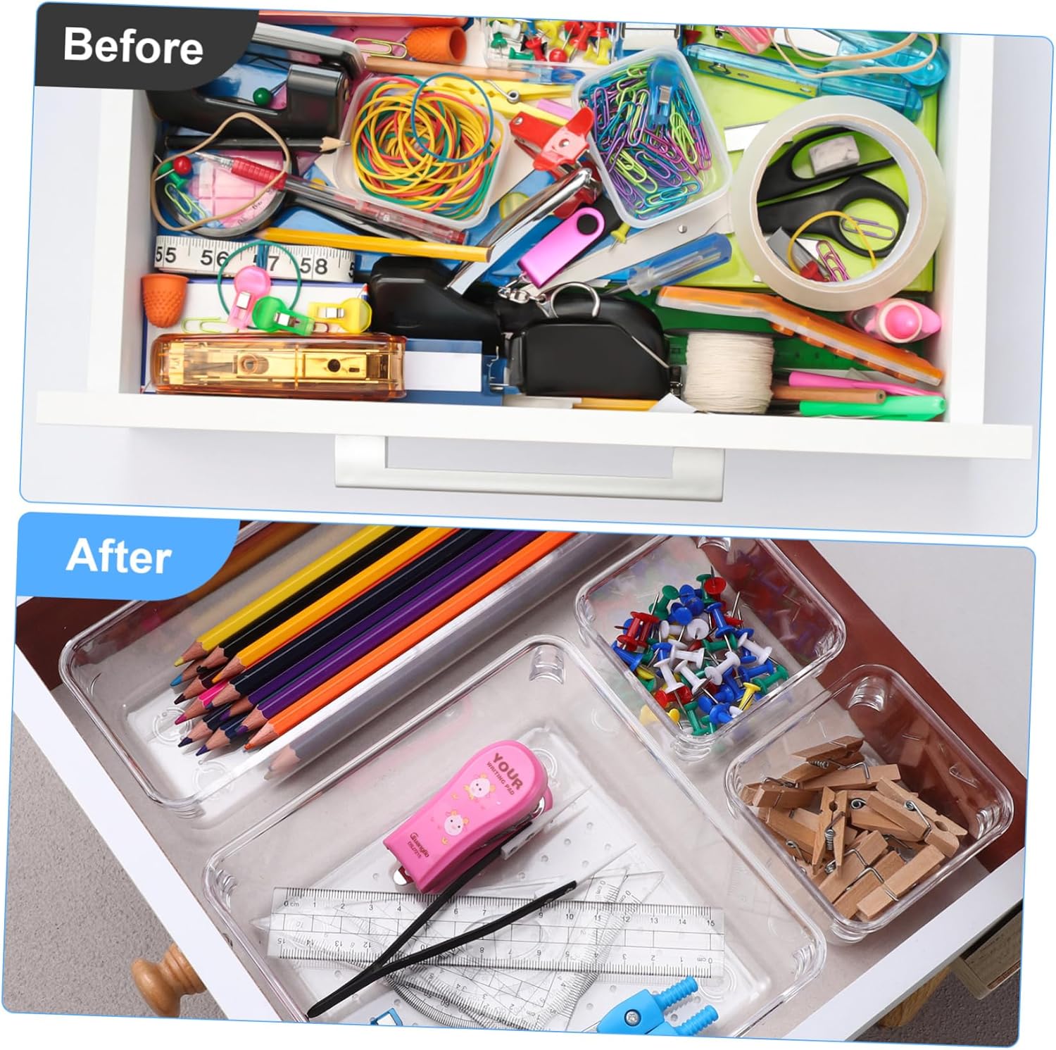 Package Include 16 x drawer storage bins 1 x sheet of adhesive dots Characteristics -Material:Plastic bathroom organizer - Wide application: Drawer storage trays can be used in various settings, including the kitchen, bathroom, office, and more Makeup Organizer For Vanity Drawer. - combination: These drawer storage bins can be used in combination with each other, allowing you to create a preferred organization system that fits your specific needs organization and storage. -Size:23.00X15.00X5.50cm/9.04X5.89X2.16in Vanity Organizers And Storage - Sturdy materials: The organizer bins are built to last. They can withstand daily use and are resistant to cracking, breaking or aging over time Storage Bins For Makeup. -Color:Transparent clear drawer organizers - Clear design: The drawer dividers are made of clear plastic, which makes it easy to see what's inside, allowing for quick access to the item you need organizer bins. - Various sizes: The drawer organizer bins come in a wide range of sizes, making them suitable for various items, from small office supplies to larger kitchen utensils silverware organizer.Goods DescriptionVanity Organizer The multi-functional compartments allow for easy sorting and tidying up, while the clear and sturdy materials ensure durability and easy cleaning for long-term use.drawer dividers organizer The drawer storage bins set is a versatile and practical for organizing your and maximizing space utilization