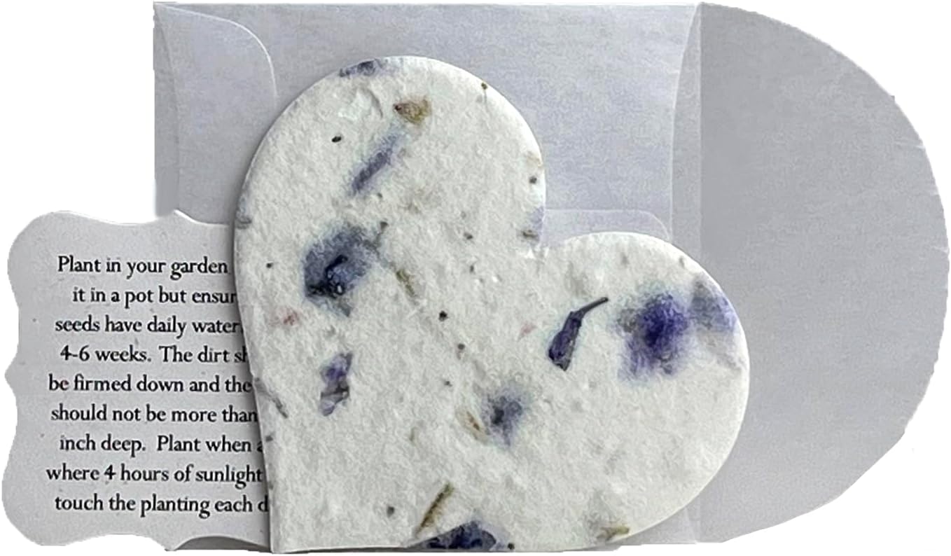 Handmade in Seattle, WA with love, our wildflower seed paper large hearts are a beautiful and sustainable way to celebrate love and friendship. Each heart is made using recycled and renewable plant fibers embedded with wildflower seeds, making them a perfect eco-friendly gift or favor for any occasion. Each heart comes with it's own glassine envelope and planting instructions tag, making them easy to hand out. The hearts are carefully handmade by our team of artisans, who use traditional techniques to create unique and beautiful designs. Our seed paper hearts are not only beautiful, but also functional. The wildflower hearts can be planted in the garden or in a pot, and can grow into flowers that will bring joy and beauty to your surroundings. Whether you are looking for a unique gift for a loved one, or a sustainable and eco-friendly way to mark a gift or occasion, our seed paper hearts are the perfect choice.