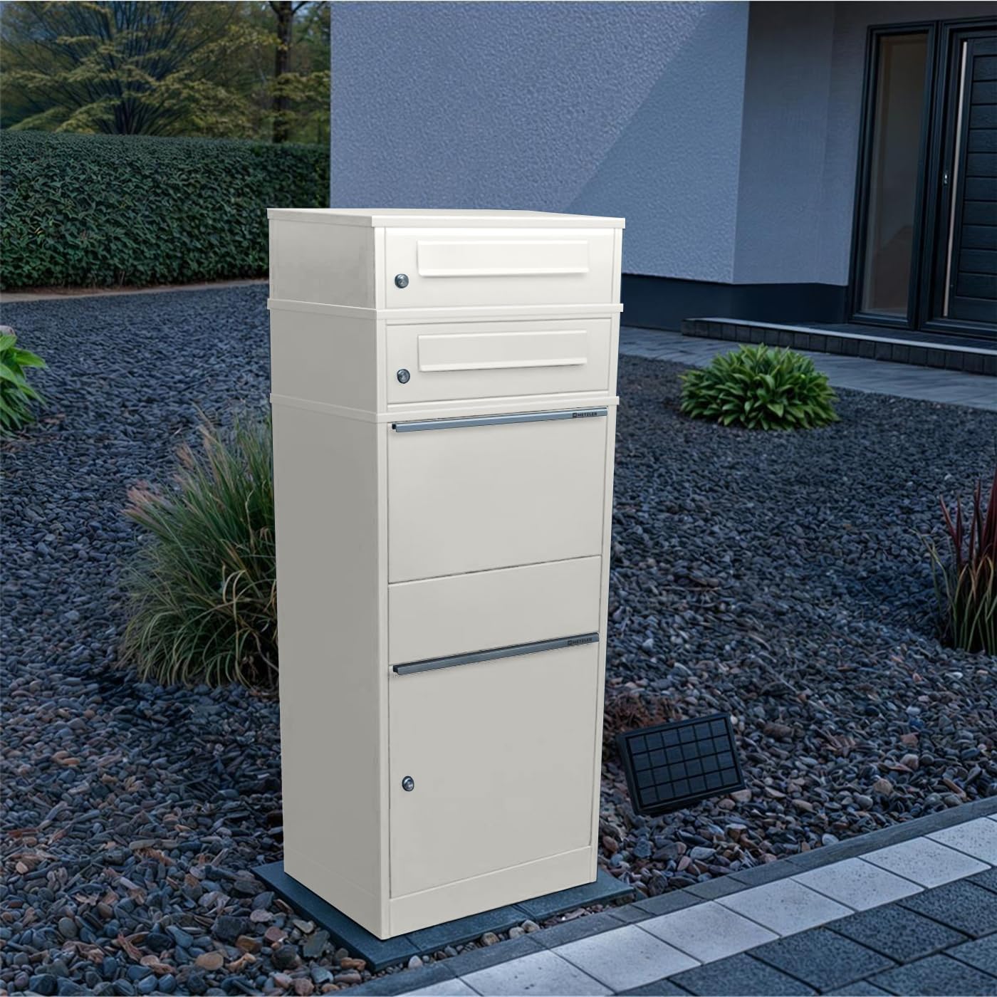 The Metzler parcel box with integrated LED solar lighting combines modern design, high functionality and reliable protection for your mail and parcels. Depending on the variant, it is equipped with one to three lockable letter compartments and also offers a generous parcel compartment for safe and contactless delivery in everyday life. Thanks to the solar-powered LED lighting, the insertion area is clearly visible even in the dark - without power connection. Made from robust, powder-coated steel, the parcel box impresses with its high weather resistance, rust resistance and durability. The surface is easy to clean and ideal for permanent outdoor use - whether in black or white. A lockable mechanism reliably protects your shipments from unauthorized access. The freestanding construction allows for flexible placement in the entryway, garden or in front of the house. Thanks to the sophisticated design, the parcel box is suitable for both single-family homes and multi-party solutions with multiple mailboxes. The combination of parcel compartment and letterboxes ensures clear separation and comfortable use in everyday life. With its modern look and practical features, the Metzler parcel box with LED lighting is a durable and stylish solution for the safe reception of your letters and parcels.