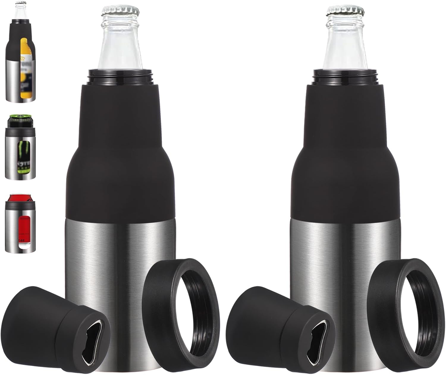This insulated bottle is suitable for both slim canisters, tall canisters, standard short canisters, and long-neck bottles. Designed with a bottle opener on the top of the cooler, no need to prepare or find another bottle opener, this cooler will take care all you need, convenient for customers to use. Suitable for different sizes of soda, coffee, beer, and other beverages, perfect for backyard barbecues, work, parties, or outdoor beach, hiking, camping, and other activitiesSpecificationColor: BlackRecommend Drink's Size: 12ozInsulation Time: 6-12 HoursMaterial: Stainless Steel 201 and 304Size: 2.91x2.91x10.2 inch / 7.4x7.4x25.9 cm (LxWxT)Packing List: Stainless Steel Can Cooler x 2AdvantageLong-lasting heat preservation and cold preservation ability, suitable for maintaining beverage temperature for a long time, keep your coffee warm on working days, or keep your drinks cold on days off.The interior and exterior of the product are made of stainless steel, waterproof and rustproof, stylish and beautiful.InstructionRotate the top lid to open the cooler, put in the drink and rotate the lid to fix it, repeat this step when replacing the drink.After use, please check whether there is condensation inside the container and clean it up, the product will not rust, but the accumulated water easily produces odor, affecting the next time useNote:Please make sure the size meets your needs before ordering. Durable product design, but should avoid hard objects to prevent damaging the product and affect the performance.