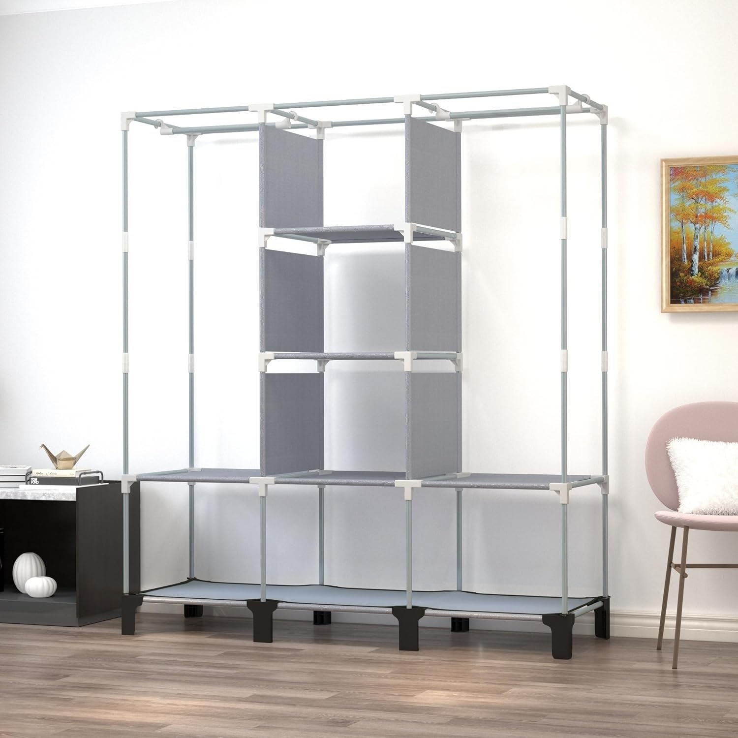 Multi-Functional Storage: This portable closet provides plenty of storage space. Wardrobe is divided into top and bottom. 2 hanging rods on the top make it easy to hang long clothes, coats, sweaters, etc. There are six storage shelves on the lower level to store folded clothes, handbags, hats and more. There are 18 pockets on each side for convenient storage of gloves, scarf, socks, and other small items. Well designed bottom seal to block dust and water stains more effectively than traditional wardrobes and keep them tidy at all times