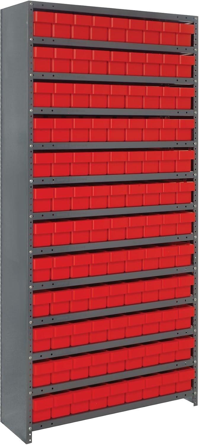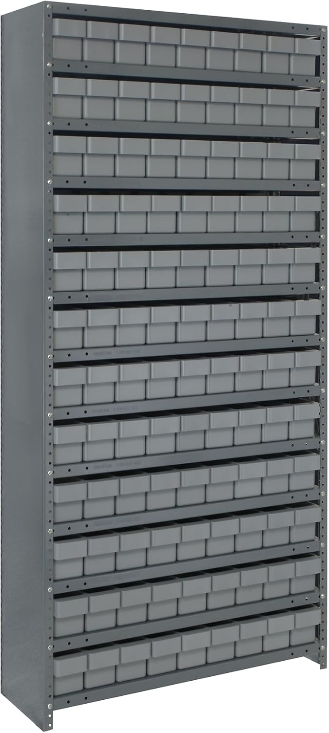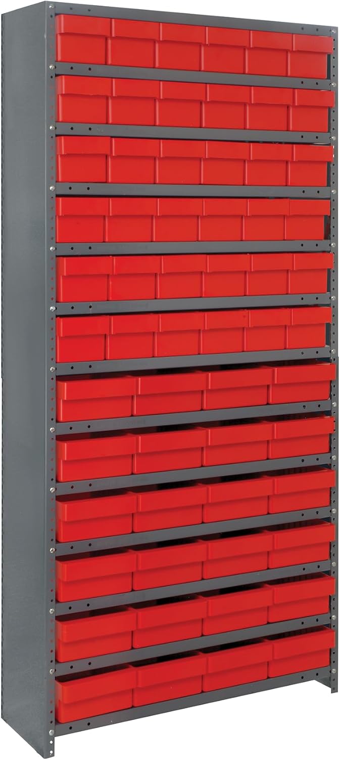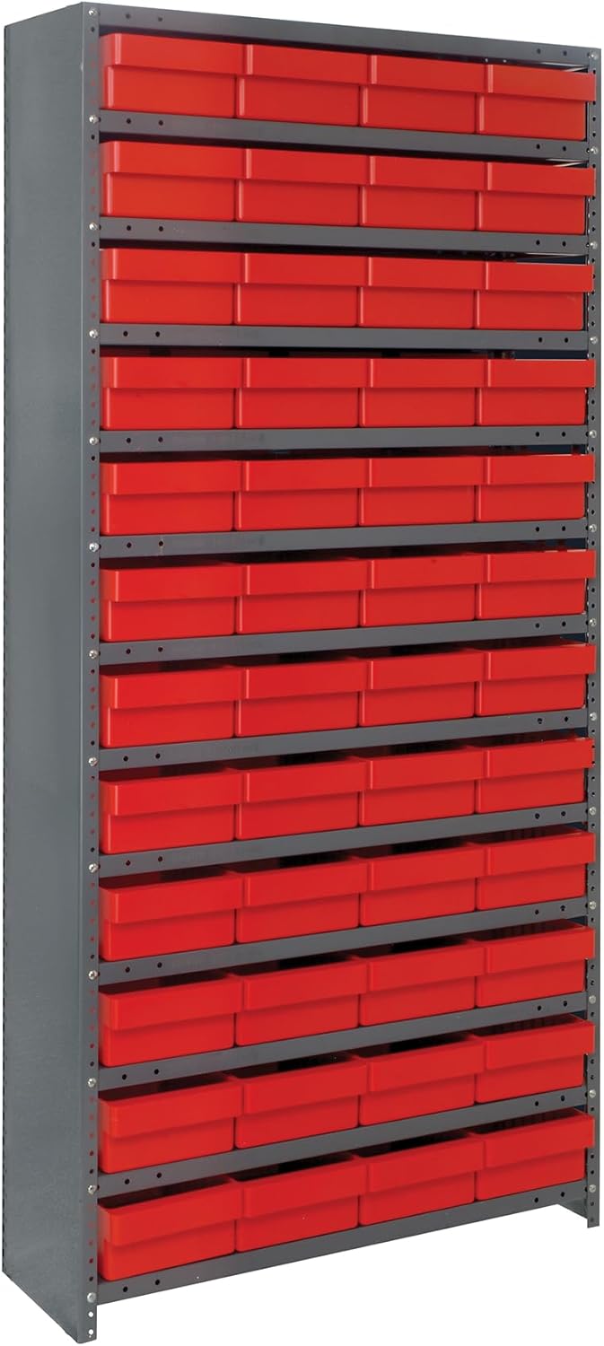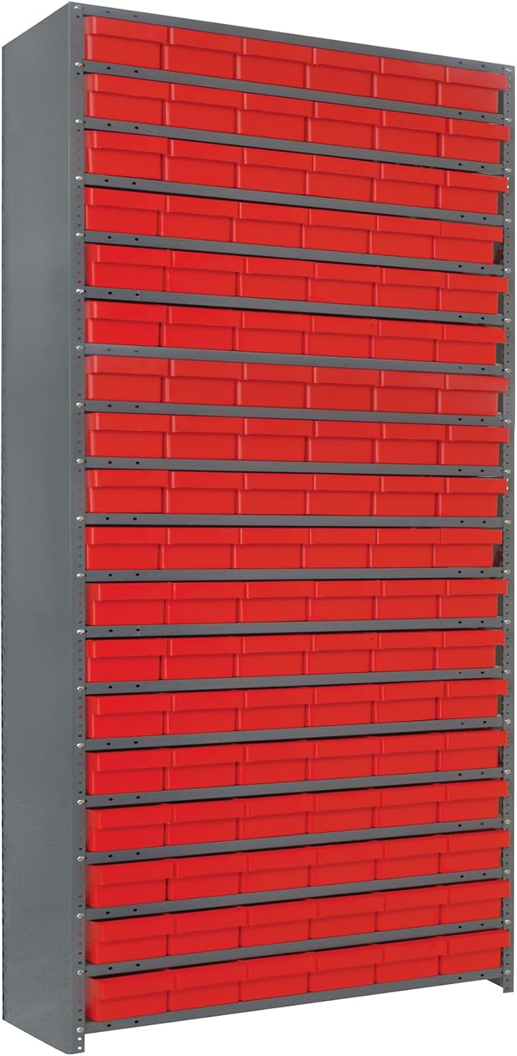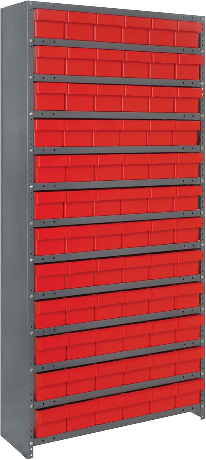 The Quantum Storage Systems Closed Shelving Units come equipped with durable bins in a single color (choose from Blue, Gray, Red, or Yellow), making it easy to organize, sort, and quickly identify stored items, enhancing overall efficiency. Constructed from high-grade steel, these units are designed to withstand the rigors of heavy-duty use, making them ideal for industrial, commercial, or residential storage applications. The closed shelving option offers a dust-free environment, ensuring that your items remain clean, secure, and protected from debris and contaminants. Available in two height options 39" and 75" these shelving units can be easily configured to meet various storage needs and fit into different spaces. Each shelf boasts an impressive 400 lbs weight capacity, providing reliable performance for storing heavy tools, equipment, and other bulky items. The sturdy construction ensures that the unit maintains its structural integrity under load, offering long-lasting durability. Whether used in a warehouse, garage, workshop, or office, the Quantum Storage Systems shelving units provide a practical and flexible storage solution. Their robust design, combined with effective organization tools and dust-free storage, makes them perfect for environments where durability and cleanliness are essential.
