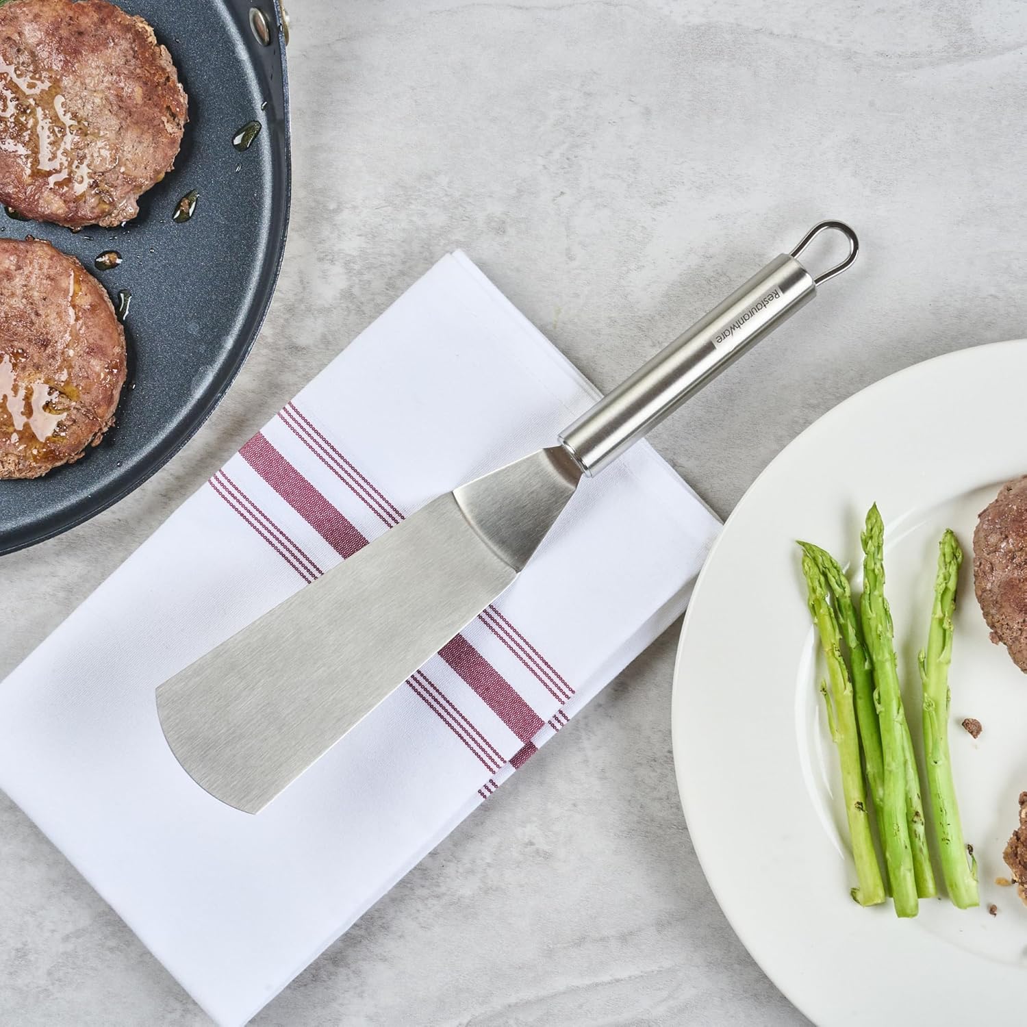 Experience precision and efficiency with our German Standard Stainless Steel Turners. These cooking spatulas feature flat and wide blade designs, allowing easy flipping, lifting, and transferring of foods such as pancakes, eggs, burgers, or fish fillets. The ergonomically designed handle of each fish spatula provides a comfortable and secure grip for reduced hand fatigue during prolonged use. Made from durable stainless steel, these pizza spatulas offer exceptional resilience for long-lasting performance in your kitchen. The built-in hook of each metal spatula offers easy storage to help keep your cooking area organized. These griddle spatulas are dishwashable and facilitate an easy cleanup. Measuring 11 inches in length by 2 inches in width by 1.5 inches in height, these stainless steel spatulas are the perfect size and shape for versatile cooking applications. Sold in a 6 count box.